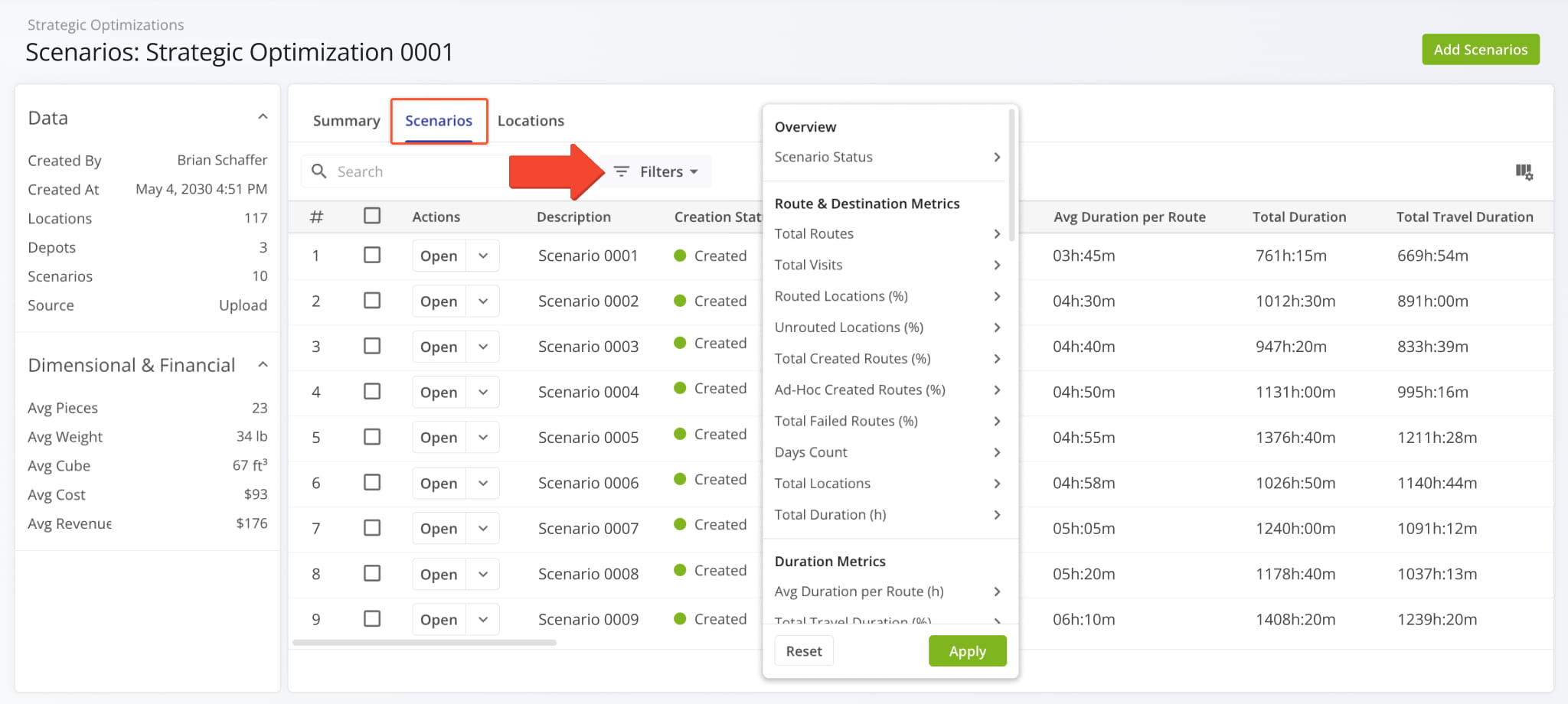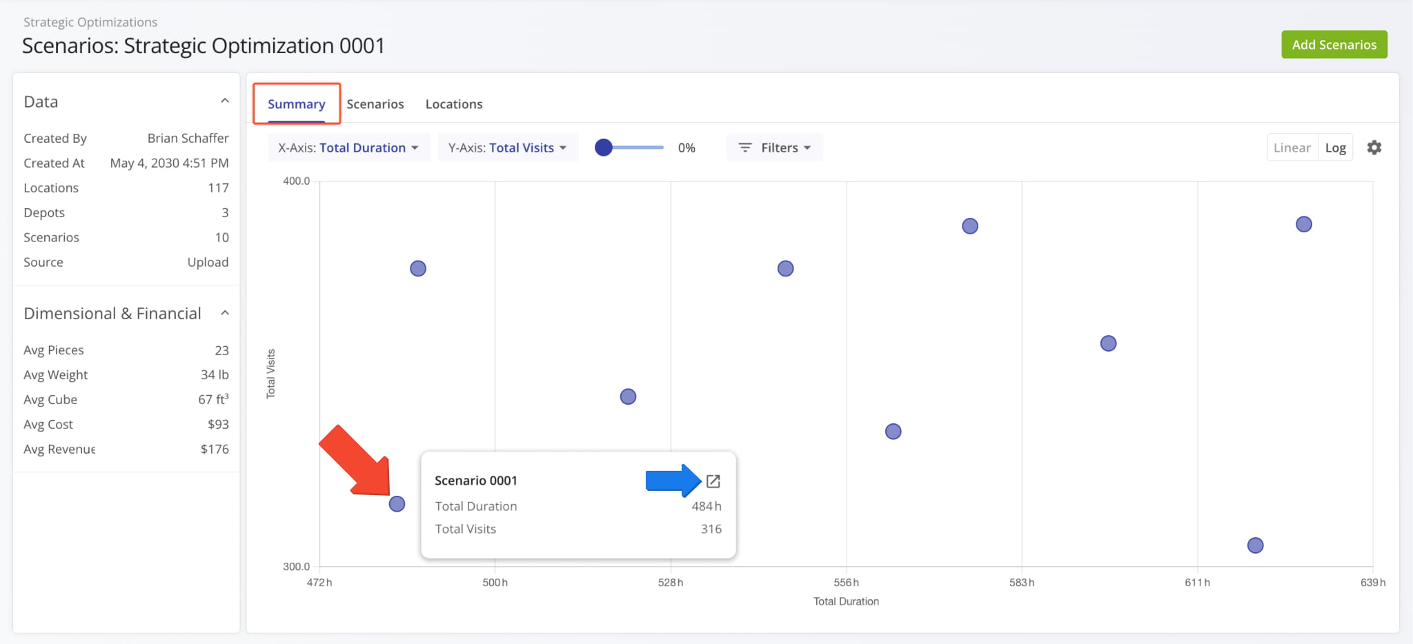 Click the “Scenarios” tab to see a customizable list of all Scenarios included in the open Strategic Optimization.
