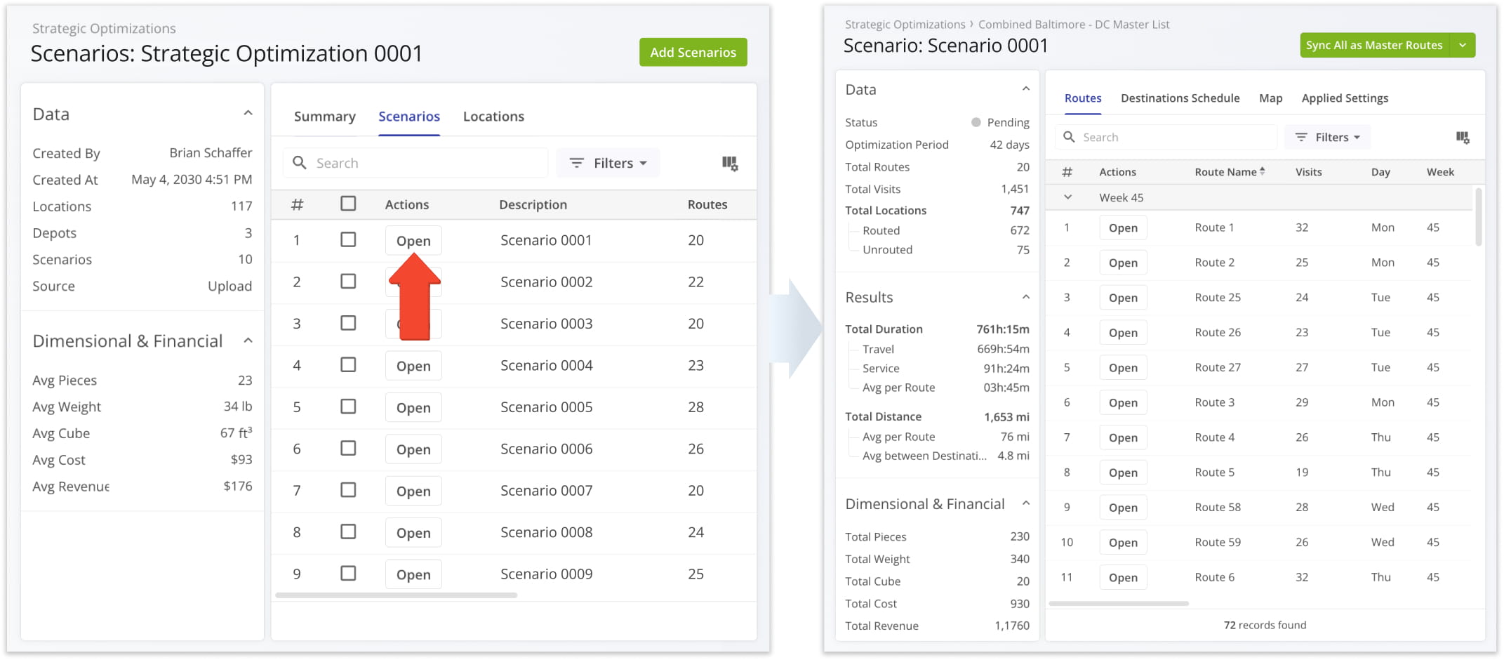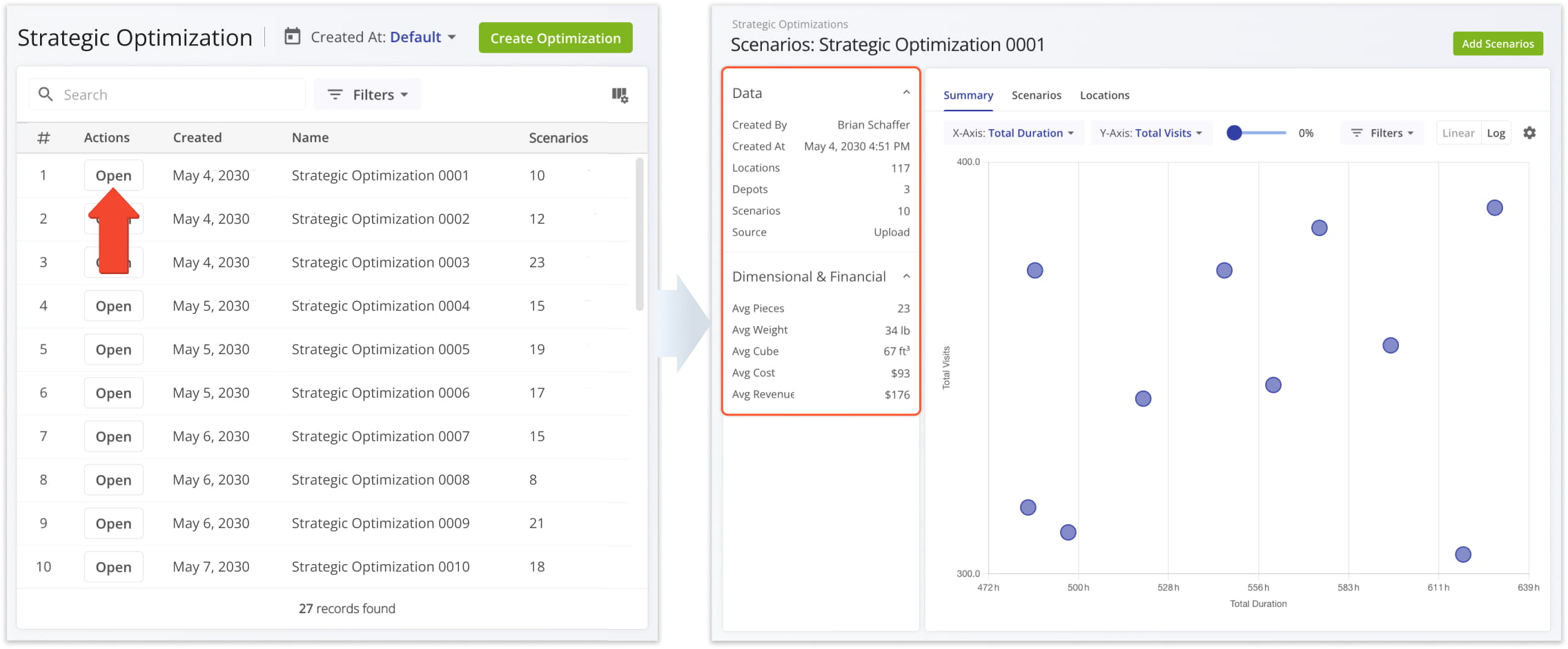 To delve deeper into strategic cycle planning and management, you can view and manage scenarios and scenarios route. Simply click the “Open” button next to a Scenario from an open Strategic Optimization.