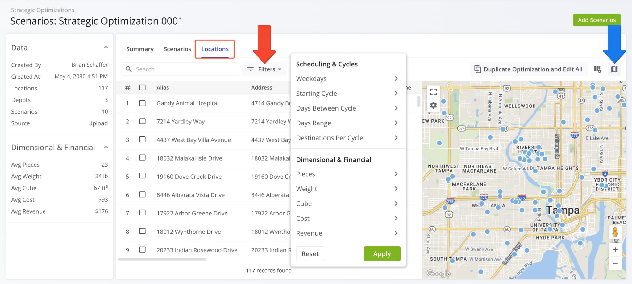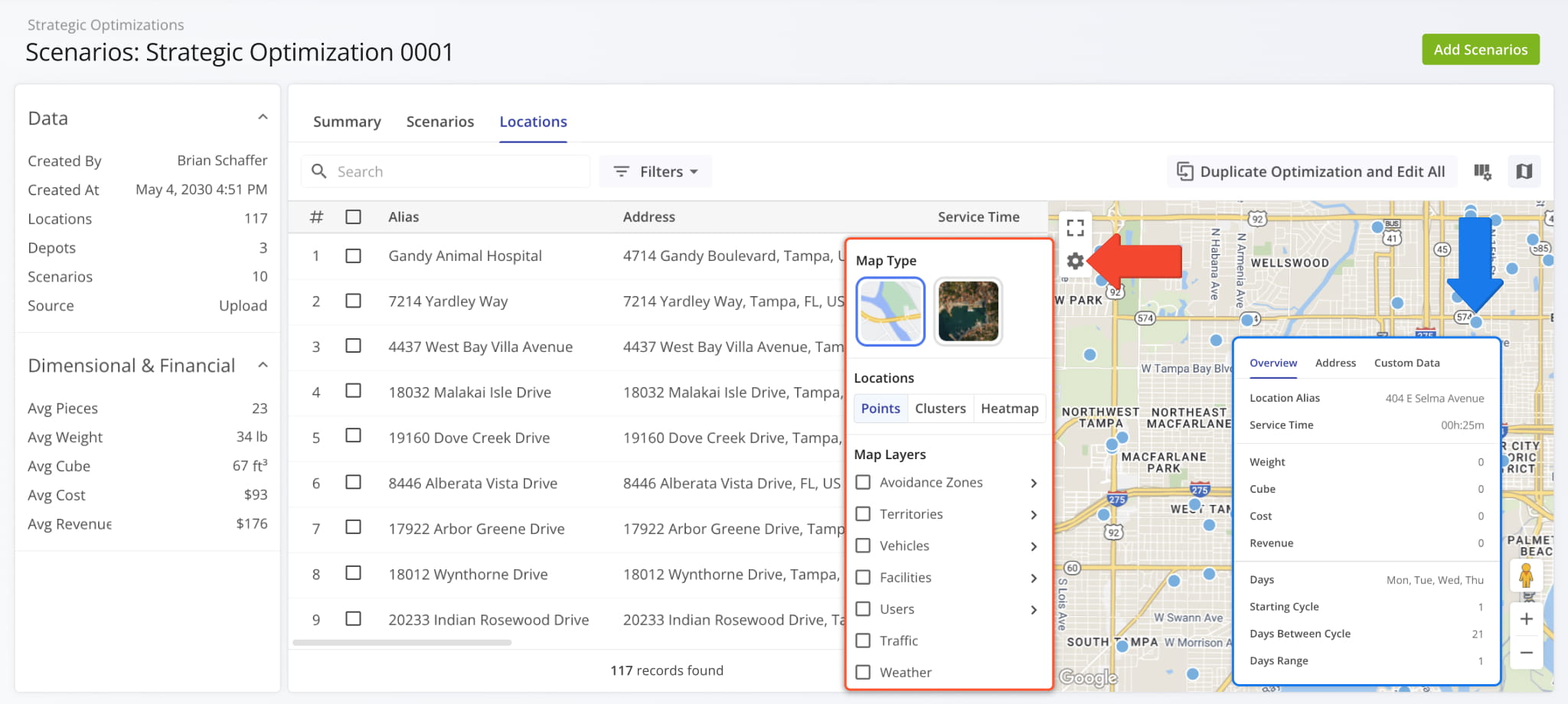 Click the “Locations” tab to see the Locations associated with the Strategic Optimization and its Scenarios. Additionally, this is where you can find data relating to the visit frequency and pattern of each Location. You can also click the Map Icon in the top-right to open the dynamic Locations Map.