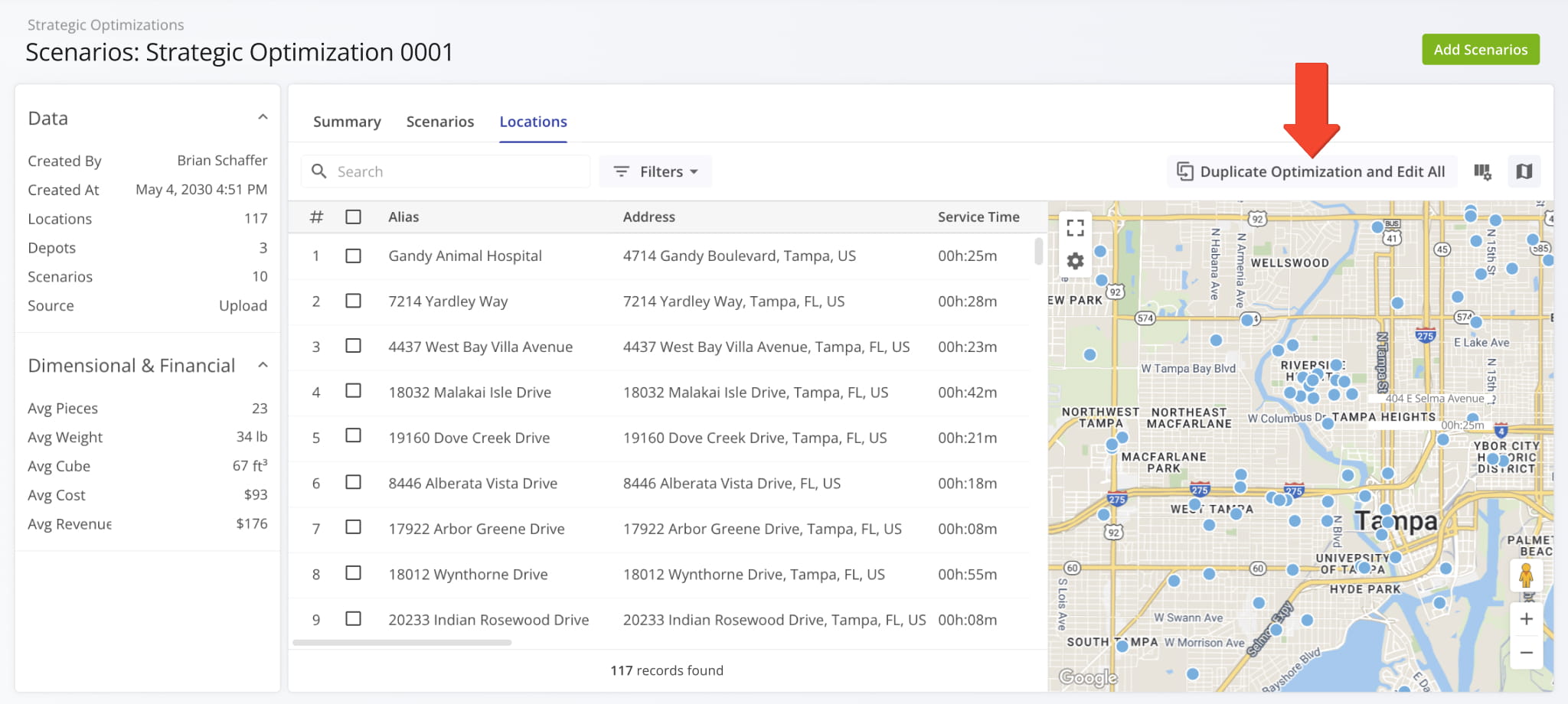 Route4Me enables you to easily duplicate complex Strategic Optimizations. Instead of going through the process of Strategic Optimization Planning, you can go to the “Locations” tab of an open optimization and click the “Duplicate Optimization and Edit All” button. It creates an editable draft based on the current optimization with all its locations and scenarios.