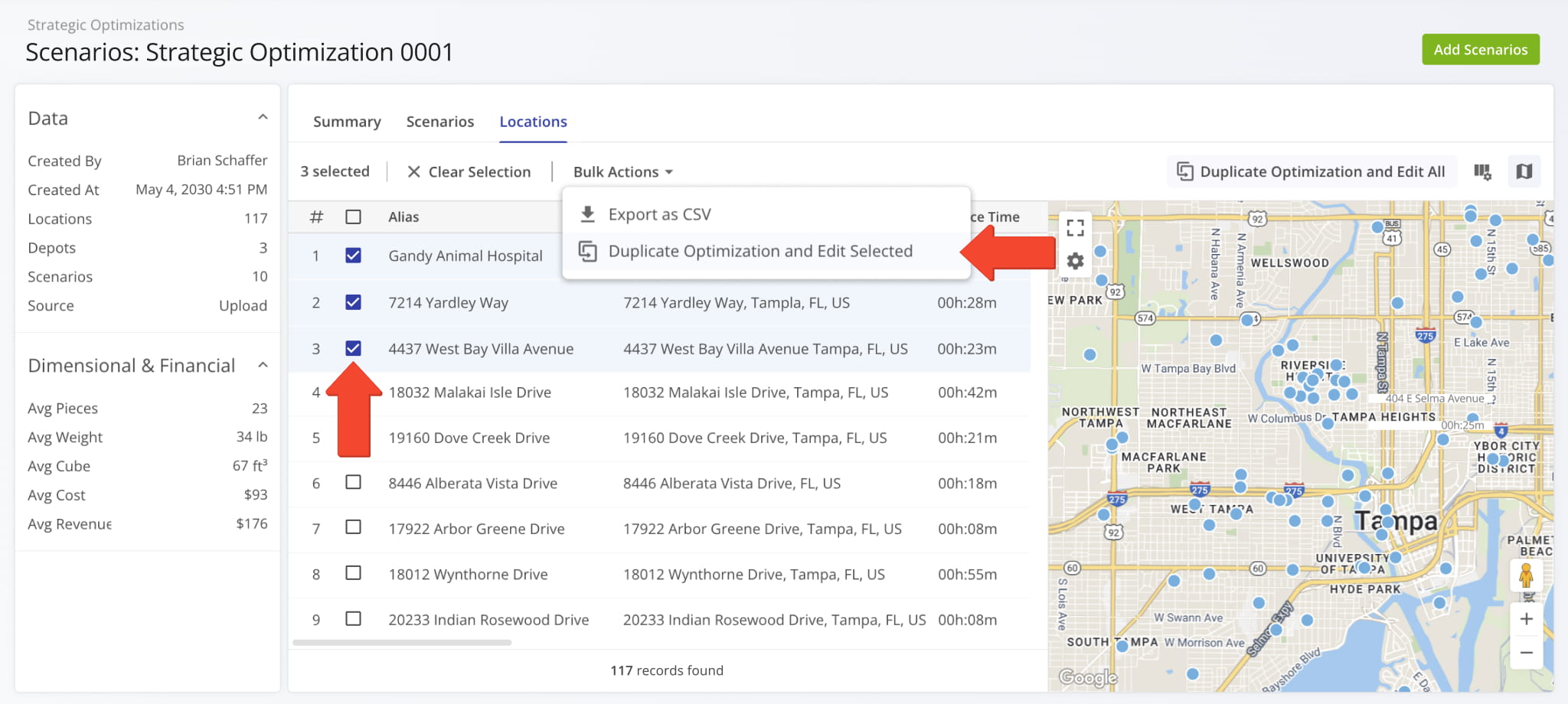 You can also do the same with only specific locations by selecting them and clicking “Bulk Actions” to access the “Duplicate Optimization and Edit Selected” option to create an editable draft based on the current optimization with the selected locations.