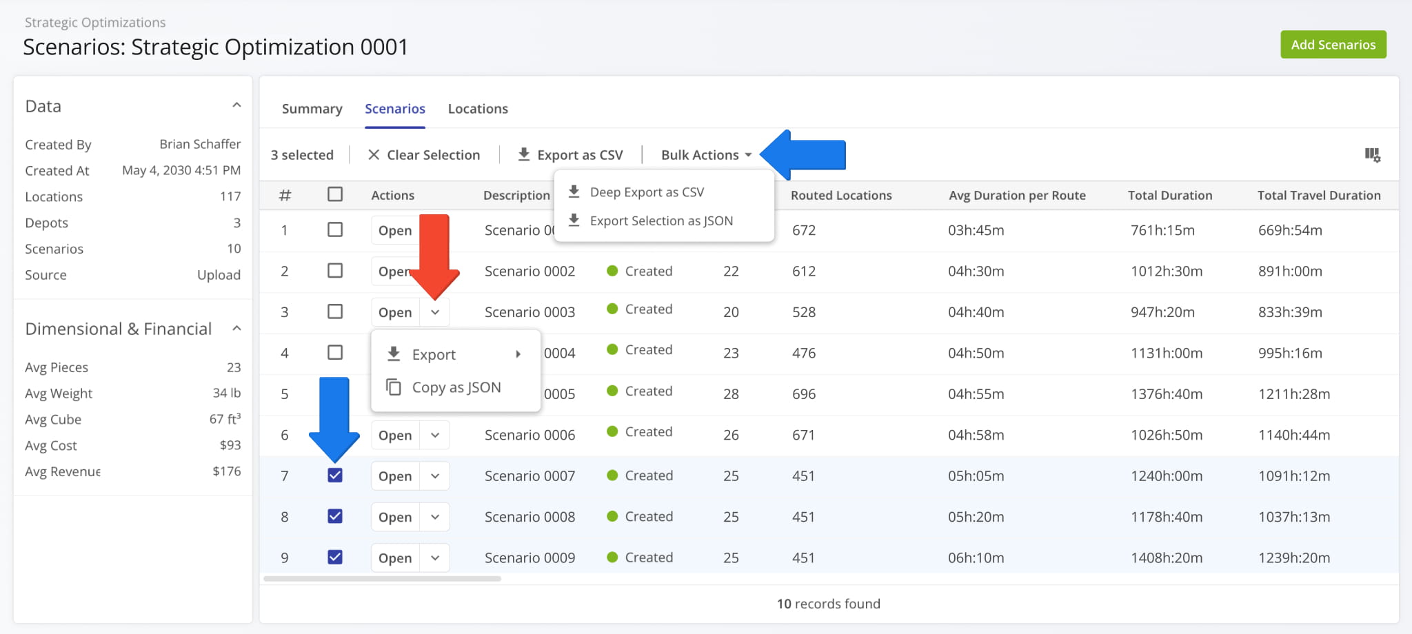 To export multiple Scenarios or copy them as JSON, check boxes next to Scenarios in the list and click “Export as CSV” or “Bulk Actions” from the action menu above the table. Learn more about Strategic Scenario Management and Export.