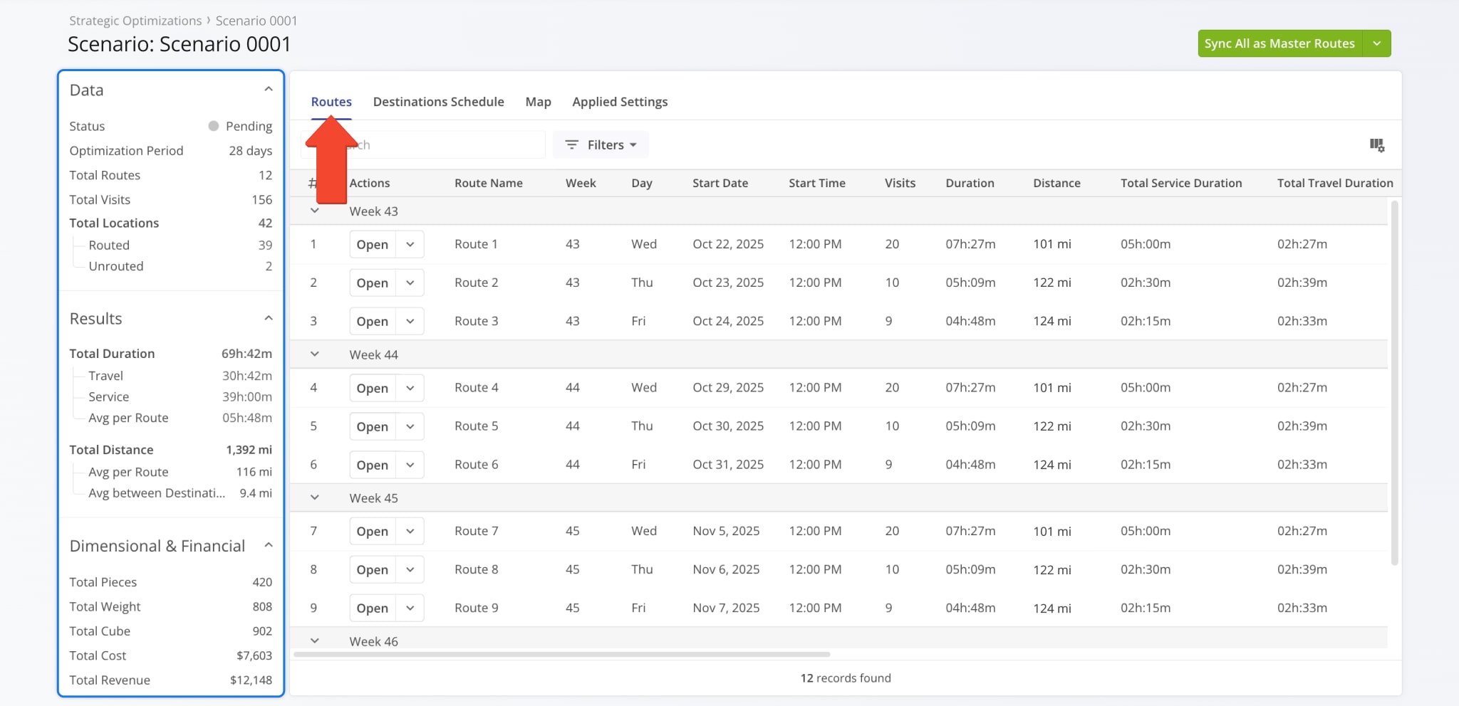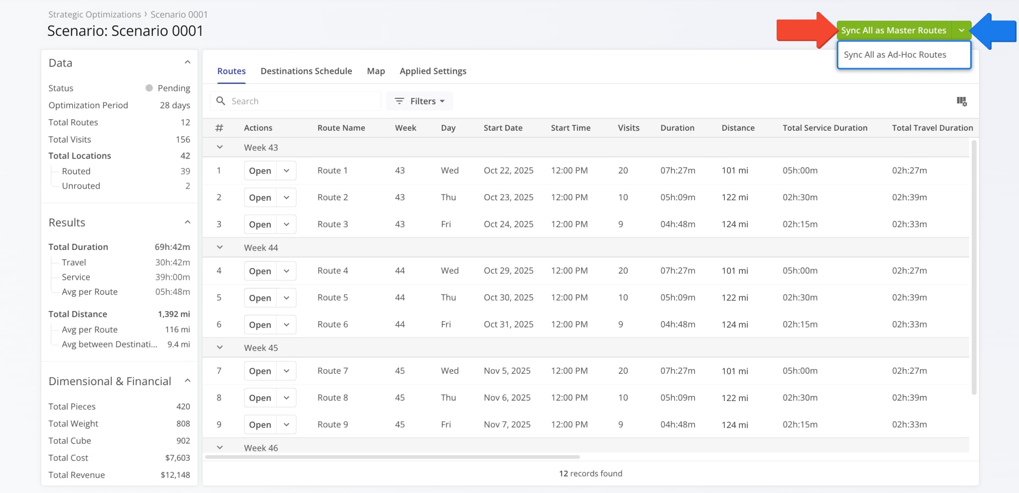After you open a scenario, click the “Sync All as Master Routes” button in the top-right to import the Scenario’s routes into your Recurring Routes with repeating schedules based on the Scenario’s Applied Settings and Destinations Schedule.