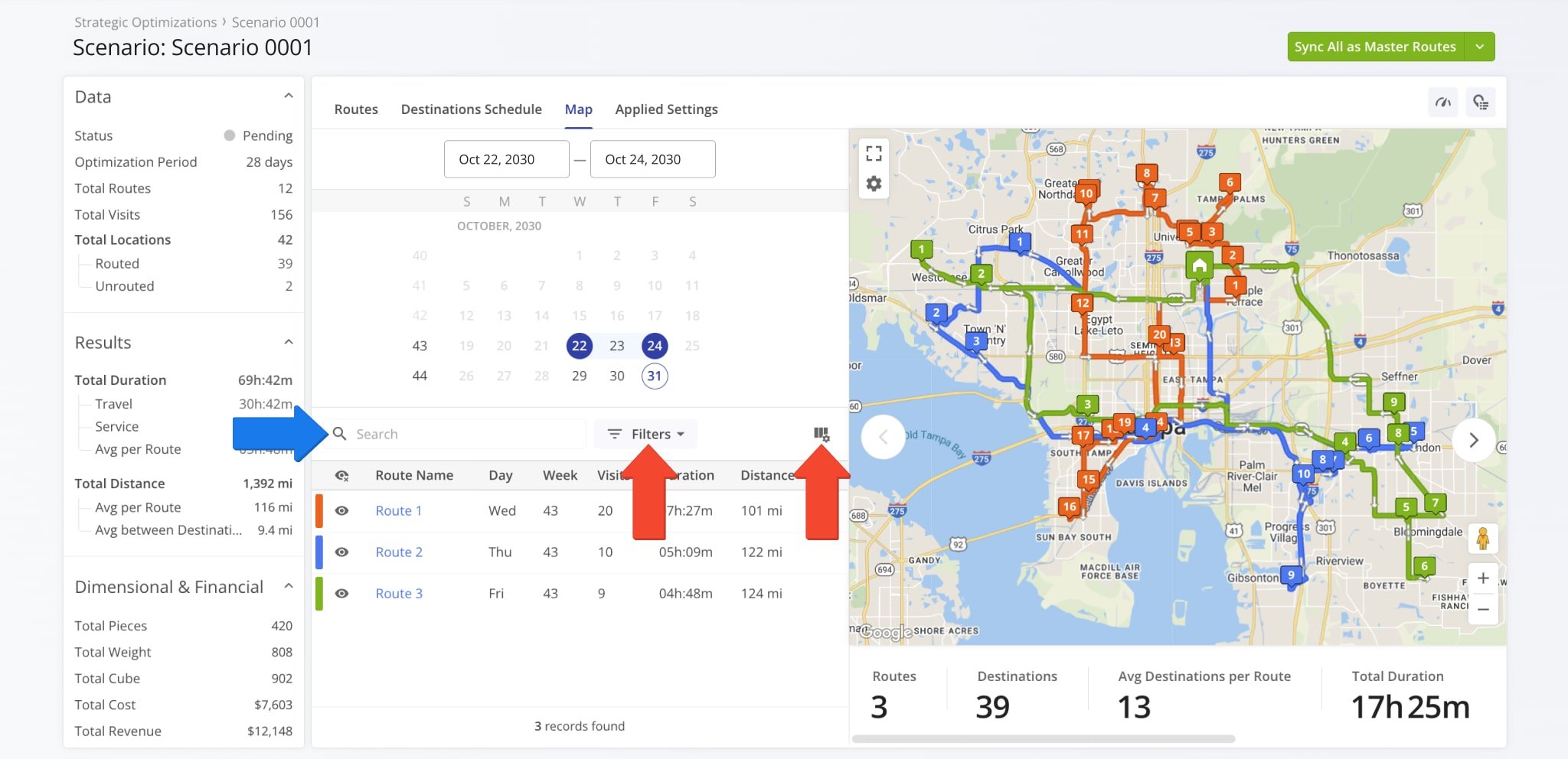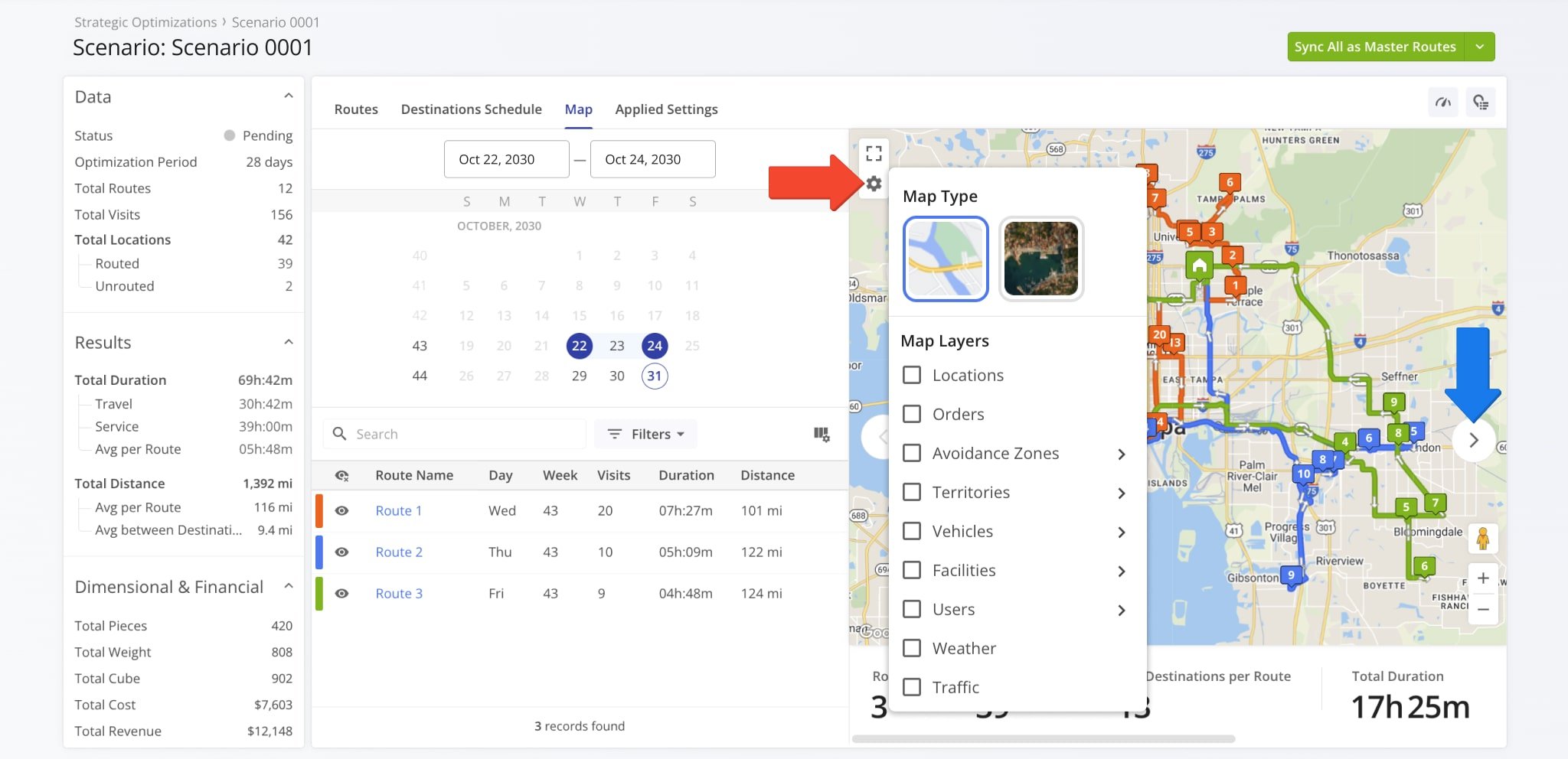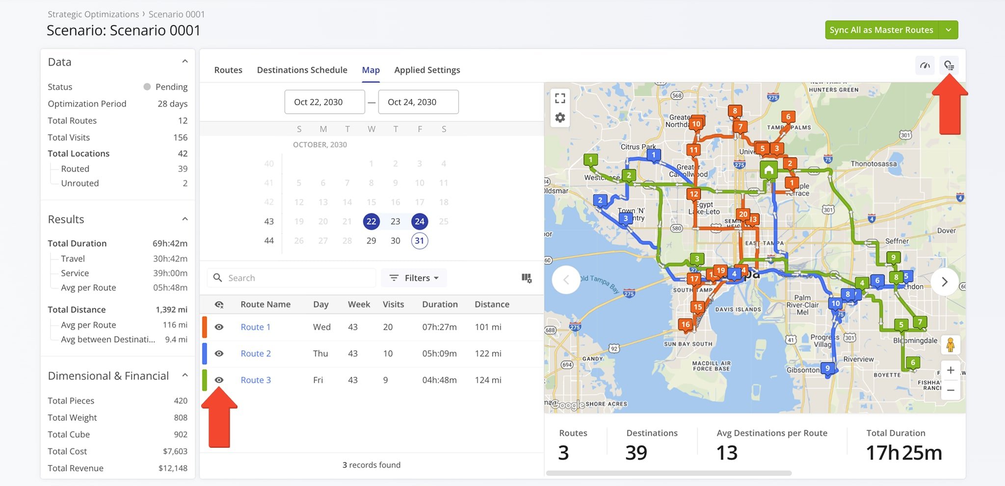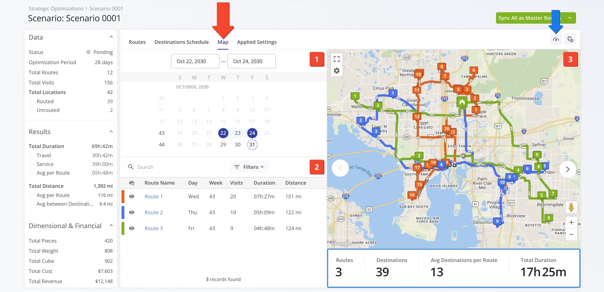 Click the “Map” tab to open the Scenario Routes Map where you can get a visual overview of routes for specific days and date ranges. You’ll see three main sections in this interface: