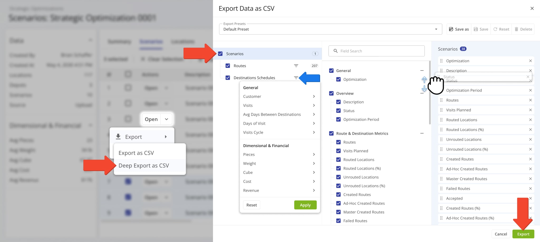 If you need deeper export customization, select “Deep Export as CSV” to access more complex export settings. Deep Export gives you access to all the data items described in this guide, divided into the same Strategic Scenarios categories.