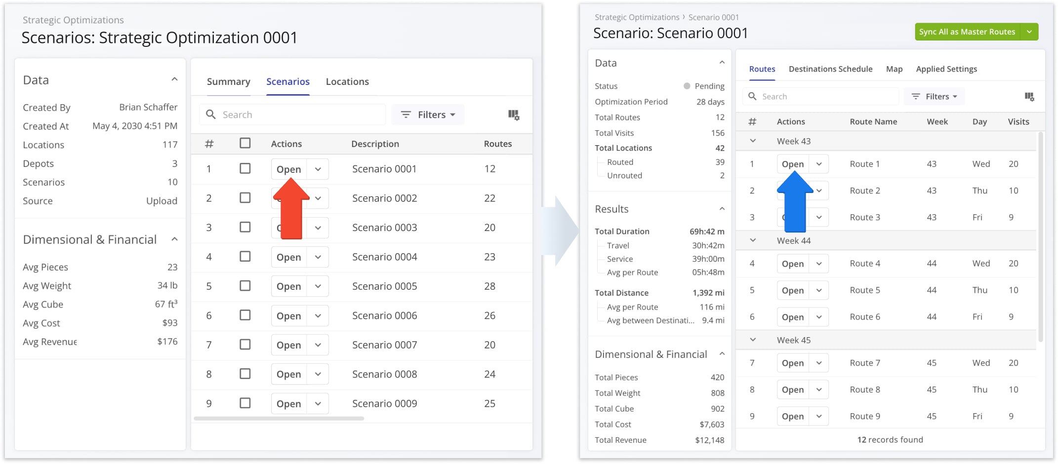 To see your Strategic Optimizations and open Scenarios, go to “Strategic Routing” > “Scenarios” from the Navigation Menu. Then, click “Open” next to a Scenario. On the Scenario’s page, you can click “Open” next to a route to see a Strategic Route Snapshot with a full breakdown of destination and route data.
