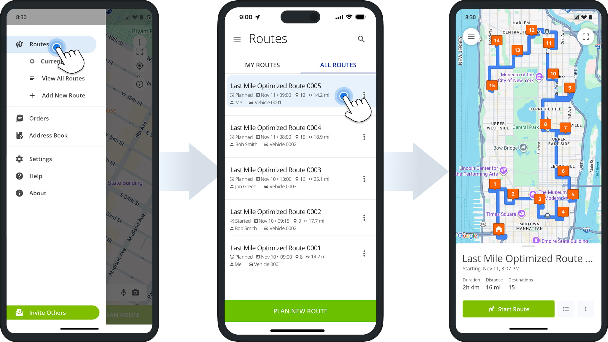 | Dispatched Routes | Open routes and view their start time, stops, map, and route metrics such as distance and total number of destinations. |
