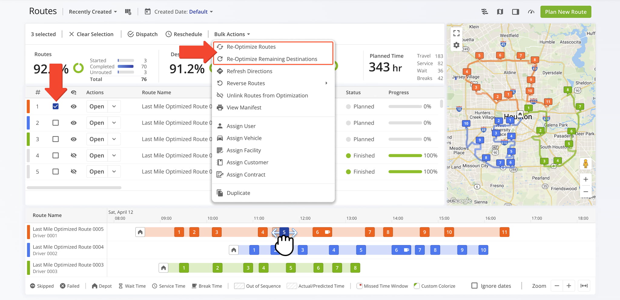 After moving a destination, you can re-optimize the route to refresh directions and timing. To do this, check the box next to the Route and select “Re-Optimize Routes” from the “Bulk Actions” menu.