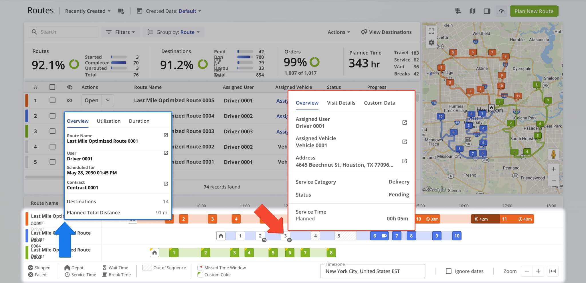 Hovering over a route or a stop in the Timeline reveals key destination details. At the same time, the Timeline’s visual layout makes it easy to spot scheduling gaps or overlaps, helping you balance routes and optimize daily operations.