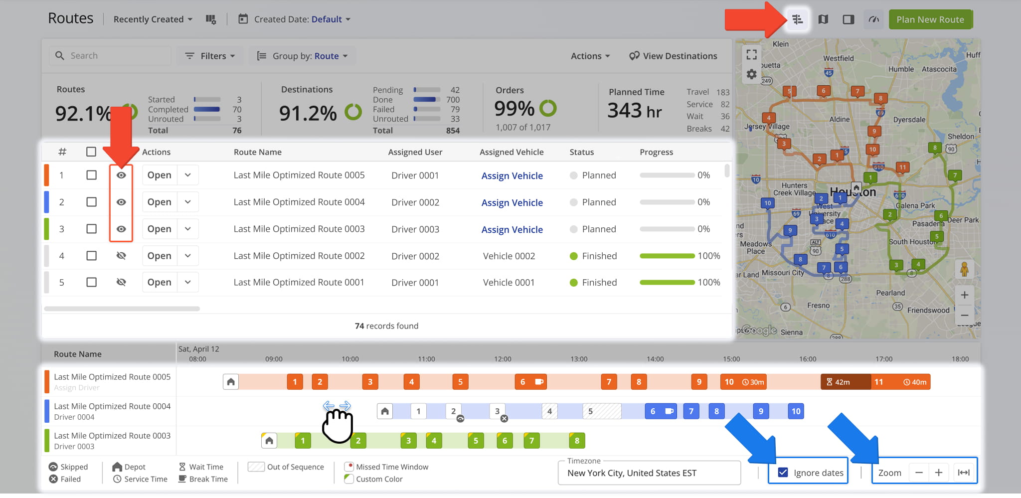 To display routes on the Timeline, click the Eye icon next to them. Selected routes appear on the Timeline based on their scheduled start times.