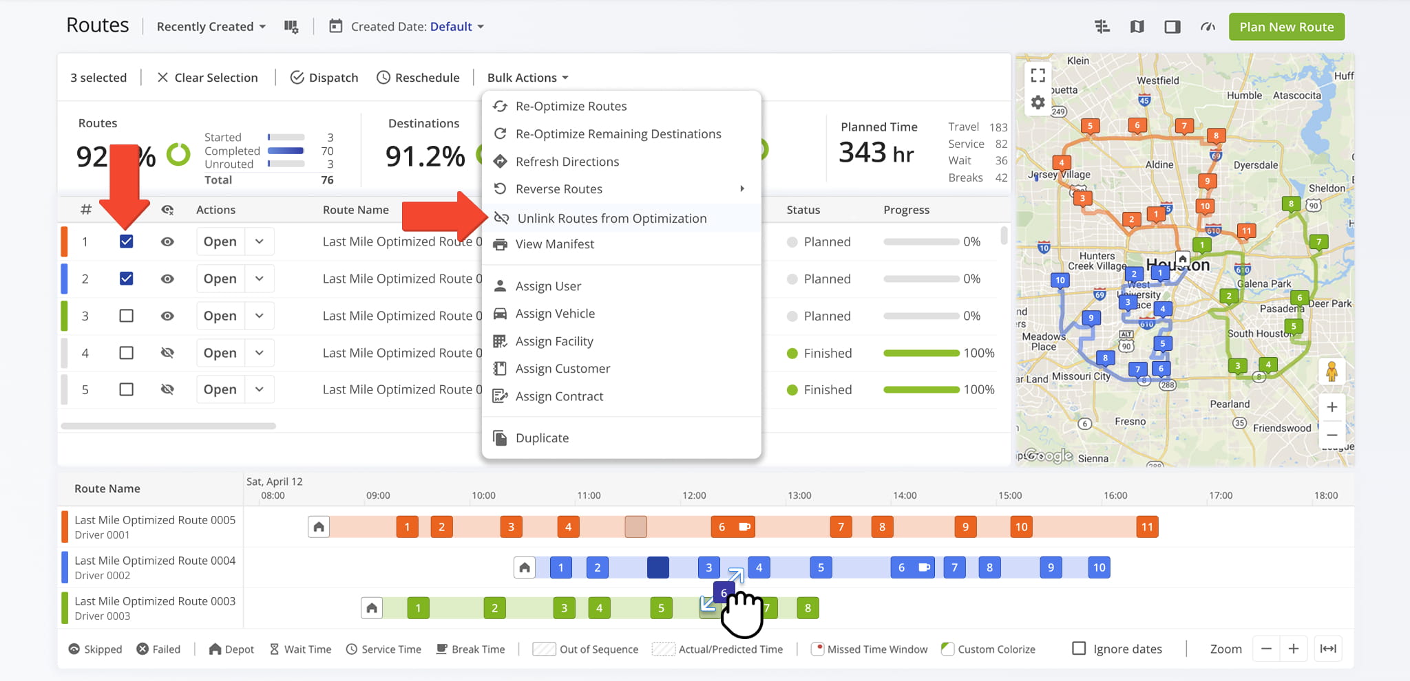 If a destination cannot be moved due to optimization constraints, first select the checkbox next to the route(s) you want to adjust, then choose “Unlink Routes from Optimization” from “Bulk Actions“.