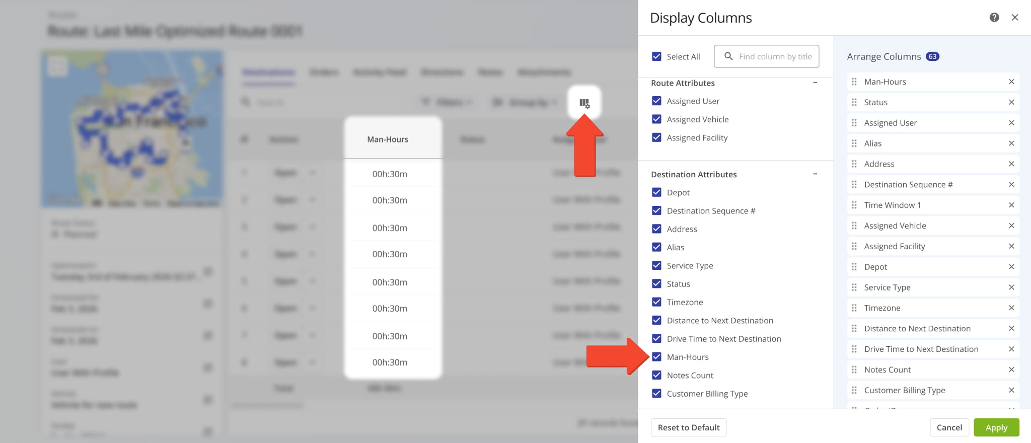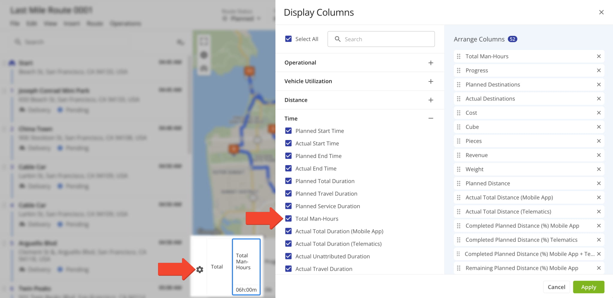 Additionally, the “Total Man-Hours” data column was added as an option in the Route Metrics Display Columns. It shows the combined “Man-Hours” values for all destinations on the opened route.