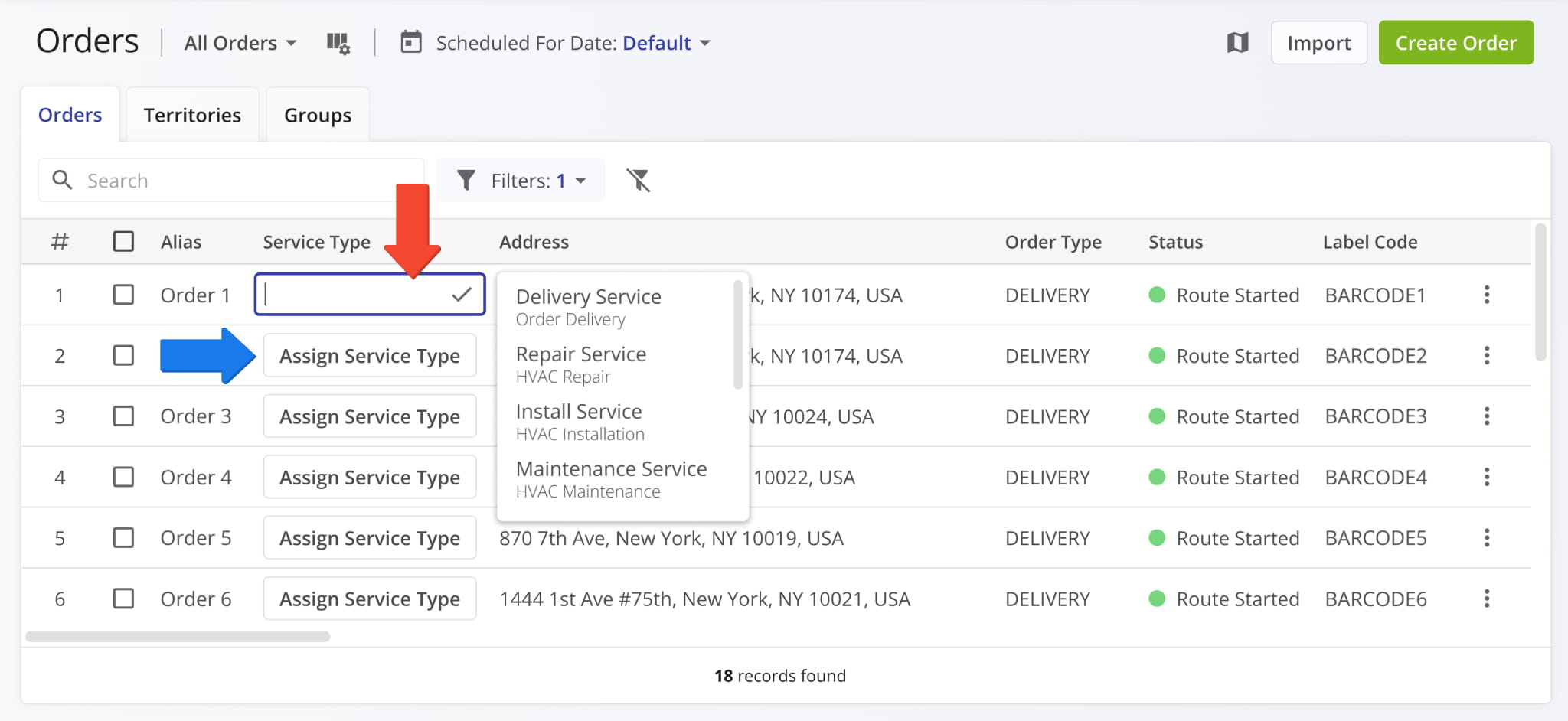 The “Service Type” column on the Orders Page now supports dynamic assignment. You can click the “Assign Service Type” button and find or select a service type for orders. To add or manage service types on your account, contact Route4Me support.