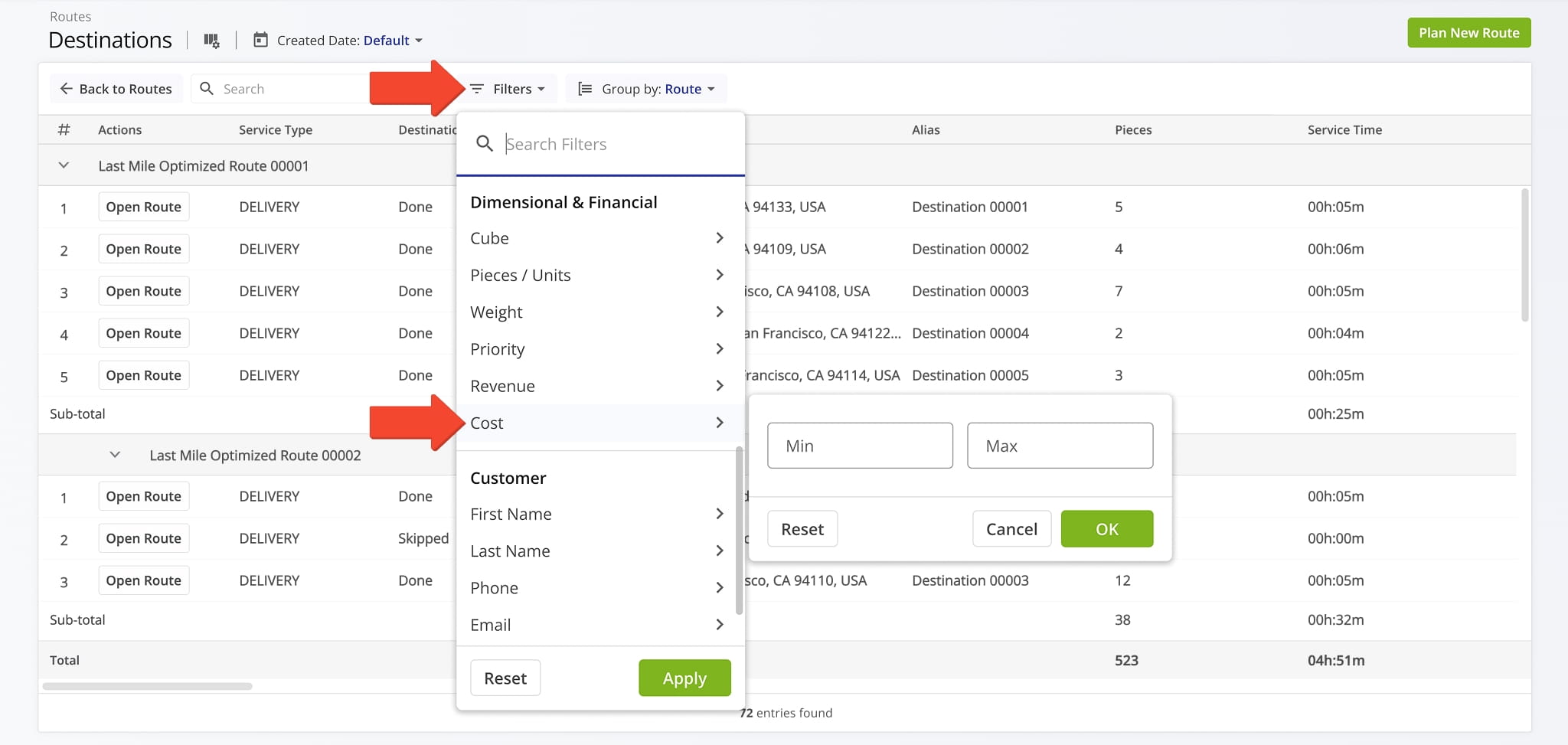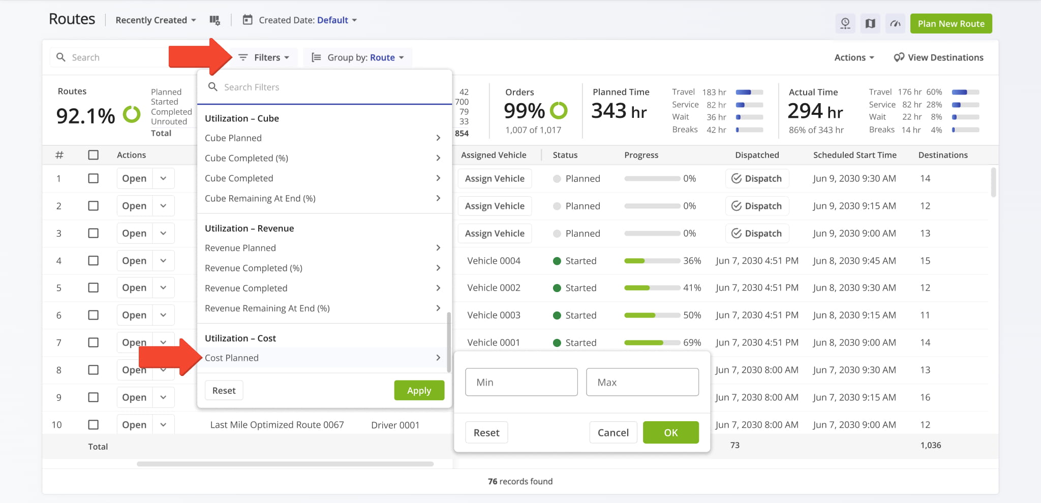 The “Utilization – Cost” filter category on the Routes Page was expanded with the following additional filter options: