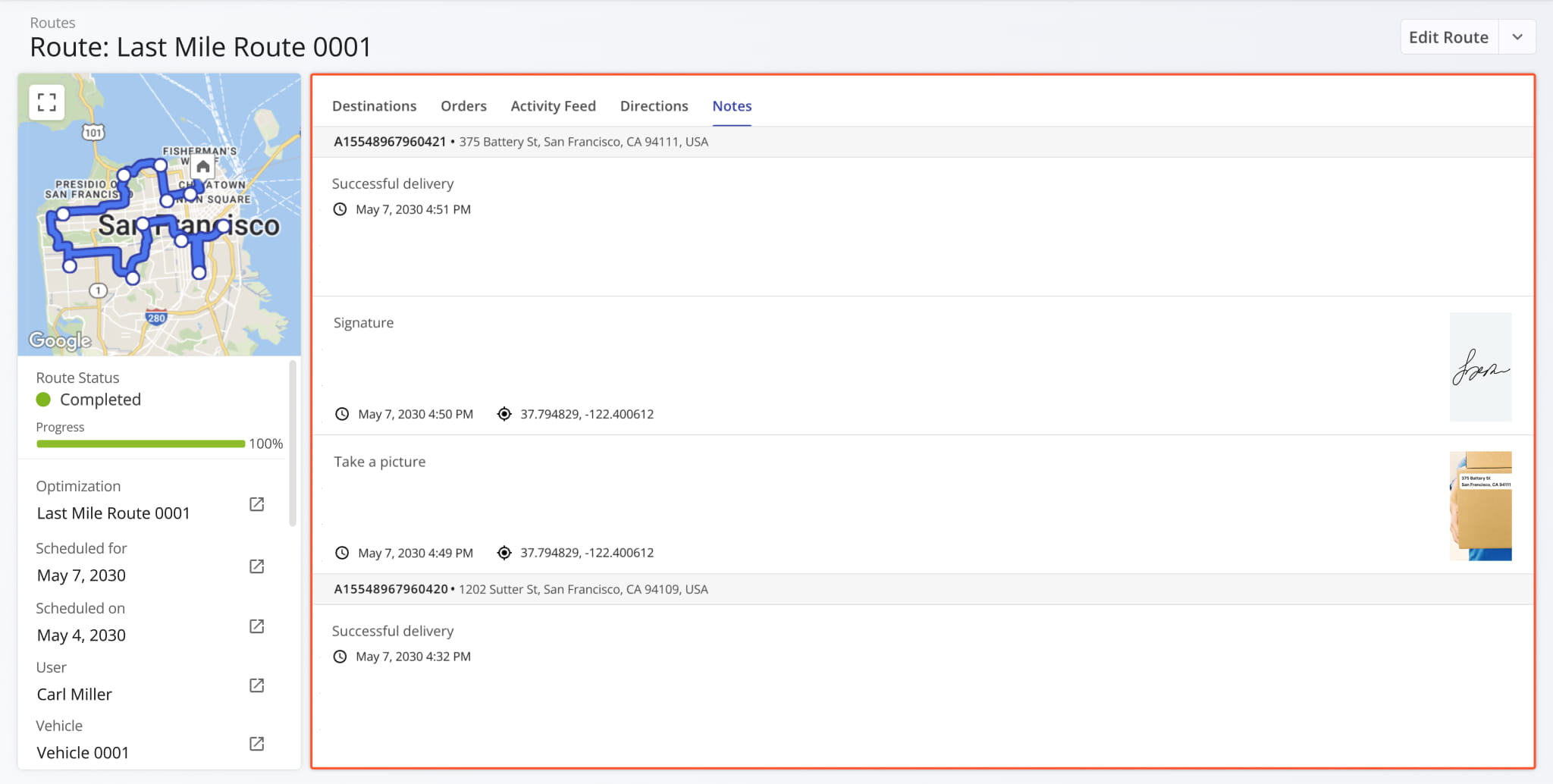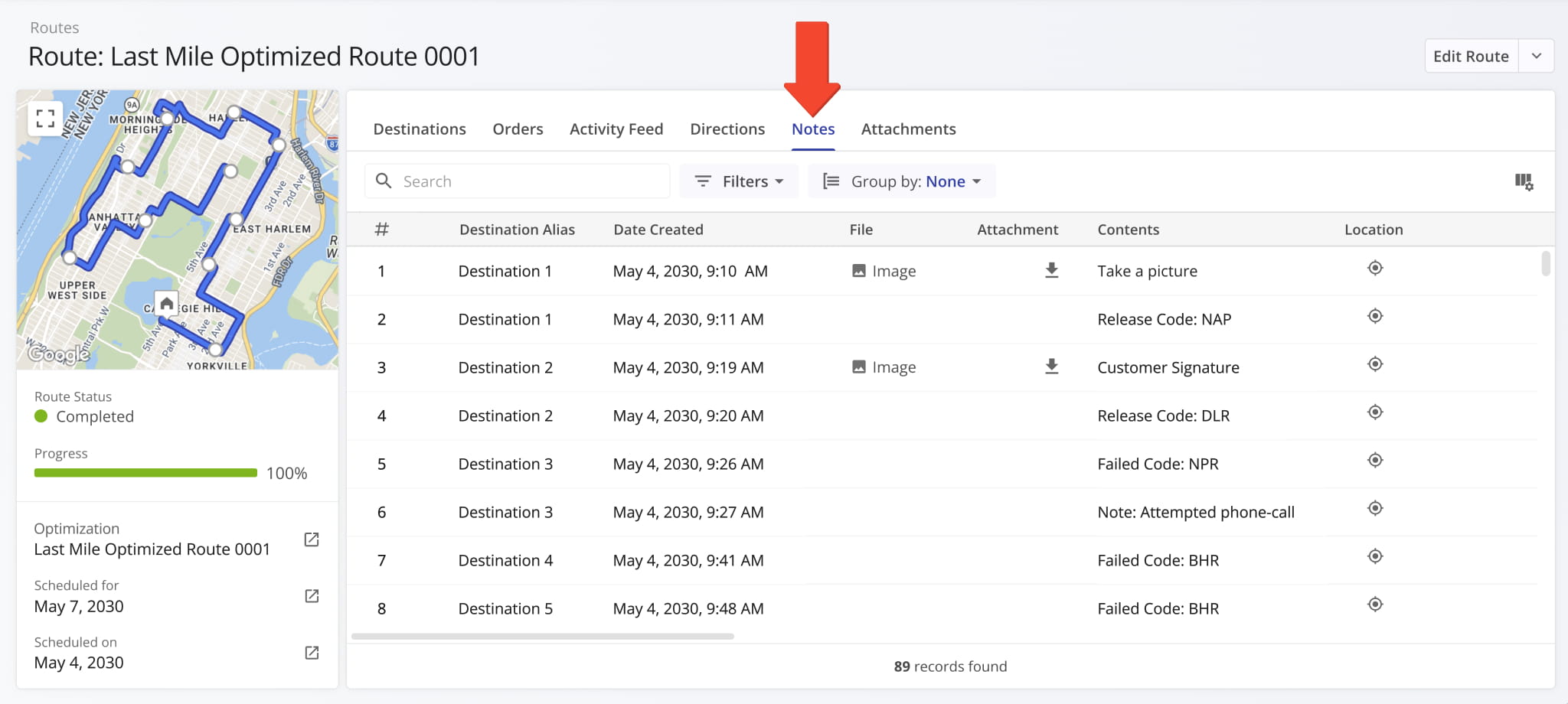 The “Notes” section of Route Snapshots has been redesigned. Previously, the “Notes” tab contained a simple data table showing Destination Note information. Now, each Note has additional context with its associated address and time always visible, as well as attachment media previews, timestamps, and more.