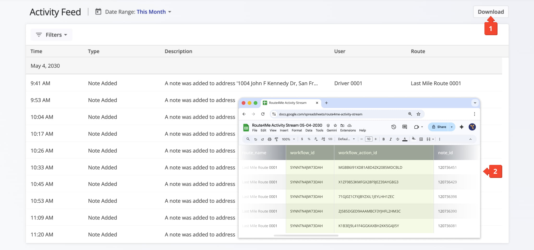 Your account’s Activity Feed now supports matching Workflow IDs and Workflow Action IDs to Destination Notes. Currently, the new data fields are visible when you export Activity Feed data by clicking the “Download” button.