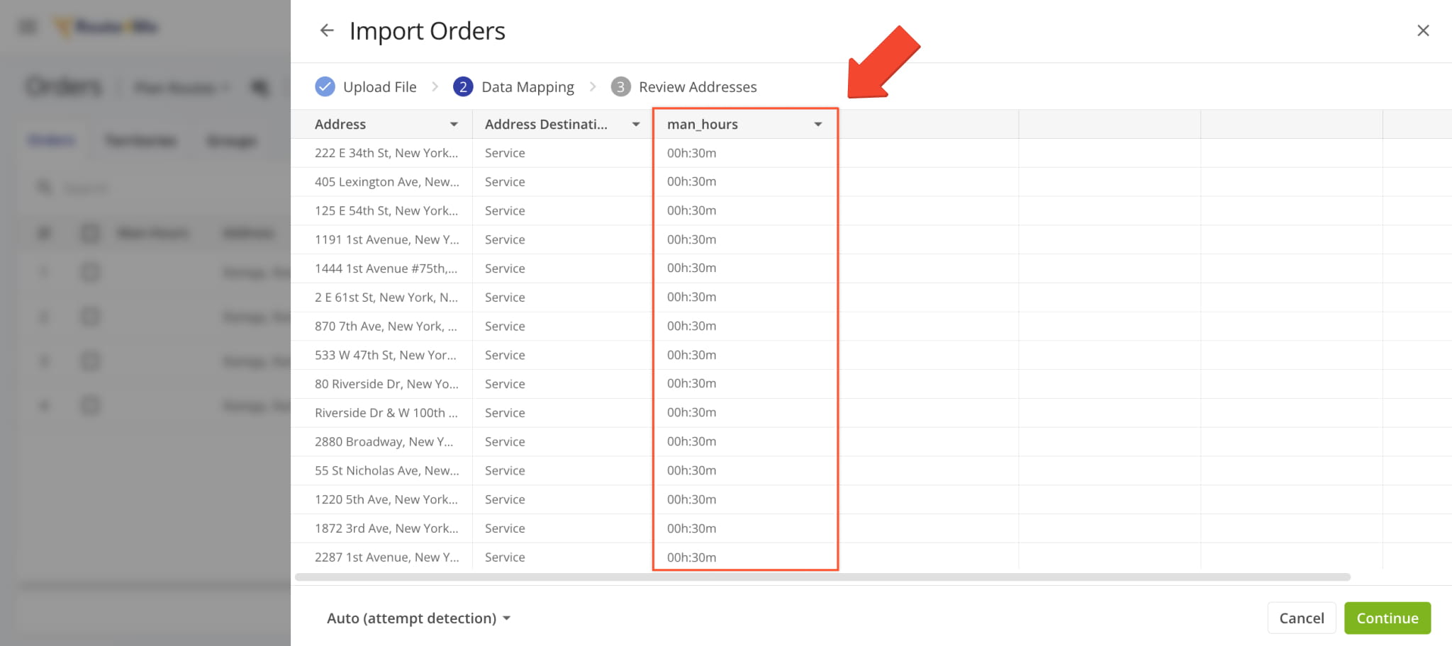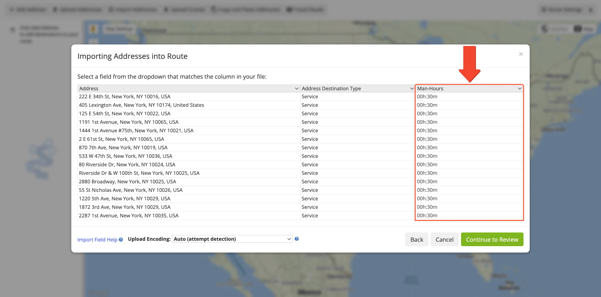 When you upload addresses to plan routes, you can add a “Man-Hours” column with time values for each address, and Route4Me will automatically validate your data and assign the corresponding man-hours values to each route destination.