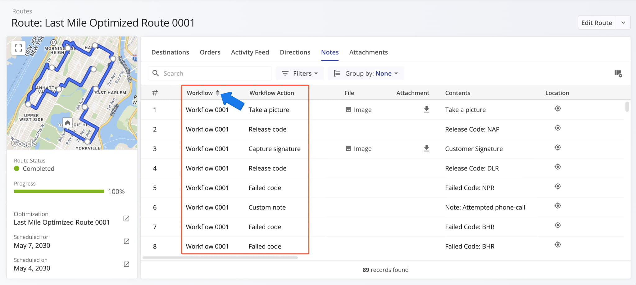 These new workflow data columns show which Workflow and action specific Destination Notes are associated with. Additionally, just like most Route4Me Display Columns, you can click the column header to sort the entire data table accordingly.