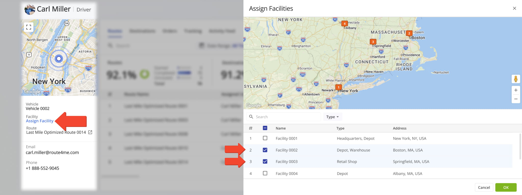 Assign Facility: Assign a specific facility to the routes, linking them to a warehouse, depot, or other facility.