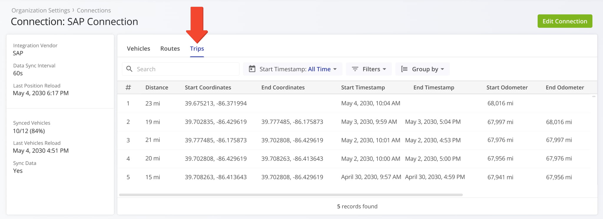A new “Trips” category was added to Connection Snapshots. It shows telematics vehicle data associated with the respective Vendor Connection such as trip distance, timestamps, odometer readings, and more.
