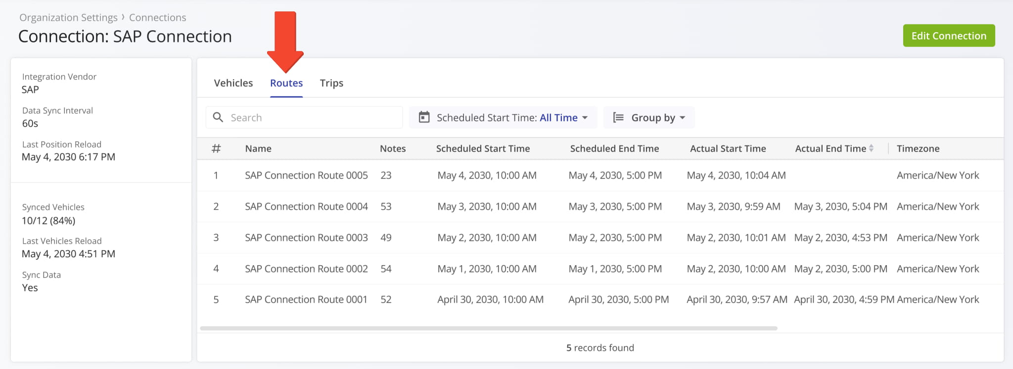 A new “Routes” category was added to Connection Snapshots. It shows route data associated with the respective Vendor Connection such as route schedule data, actual timestamps, route destination notes, and more.