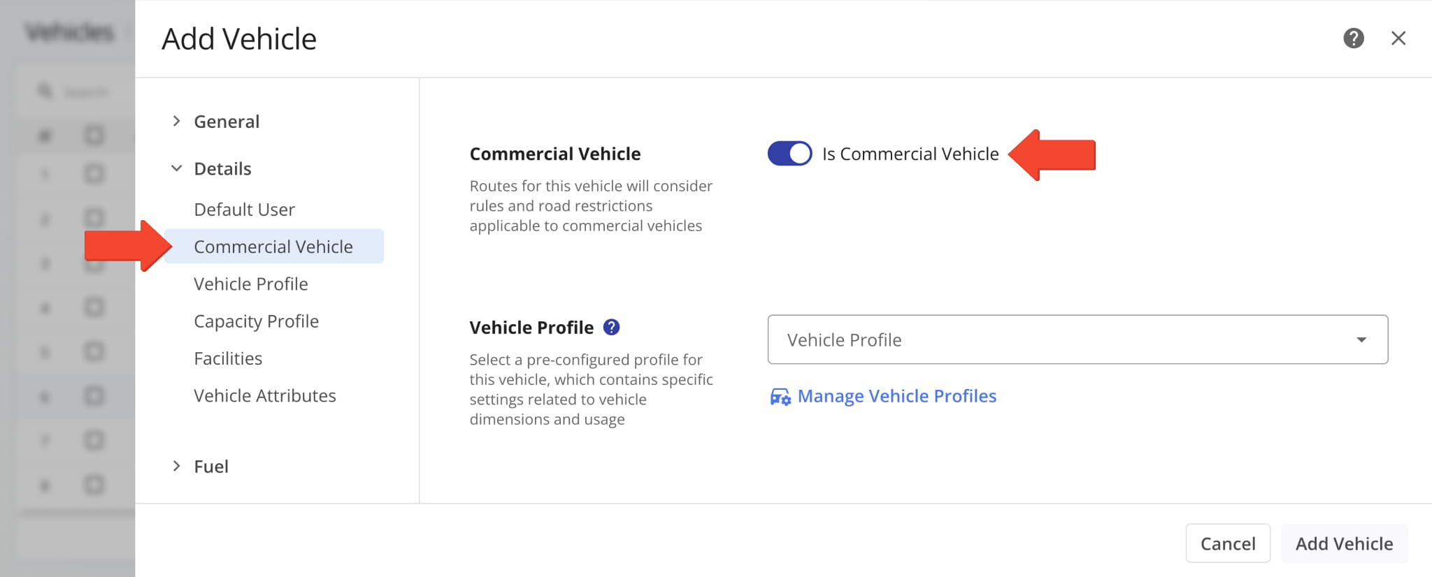 A new “Is Commercial Vehicle” toggle option was added to the “Details” section when you add and manage vehicles. When enabled, it allows you to select of a Commercial Vehicle Profile in the “Vehicle Profile” field.
