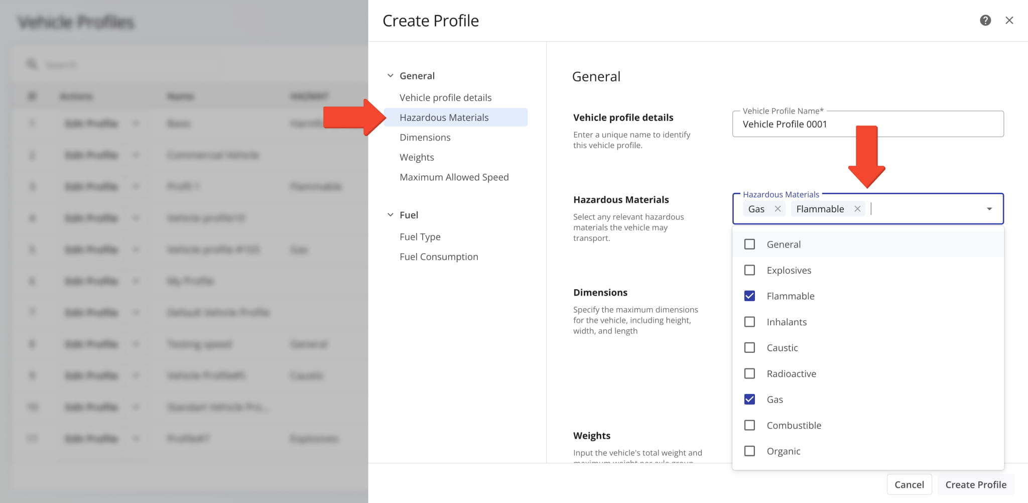 The “Hazardous Materials” field in Vehicle Profiles now supports multi-selection. Check the boxes next to options you want to include in a profile. This new functionality streamlines creating and managing profiles for commercial HAZMAT vehicles.