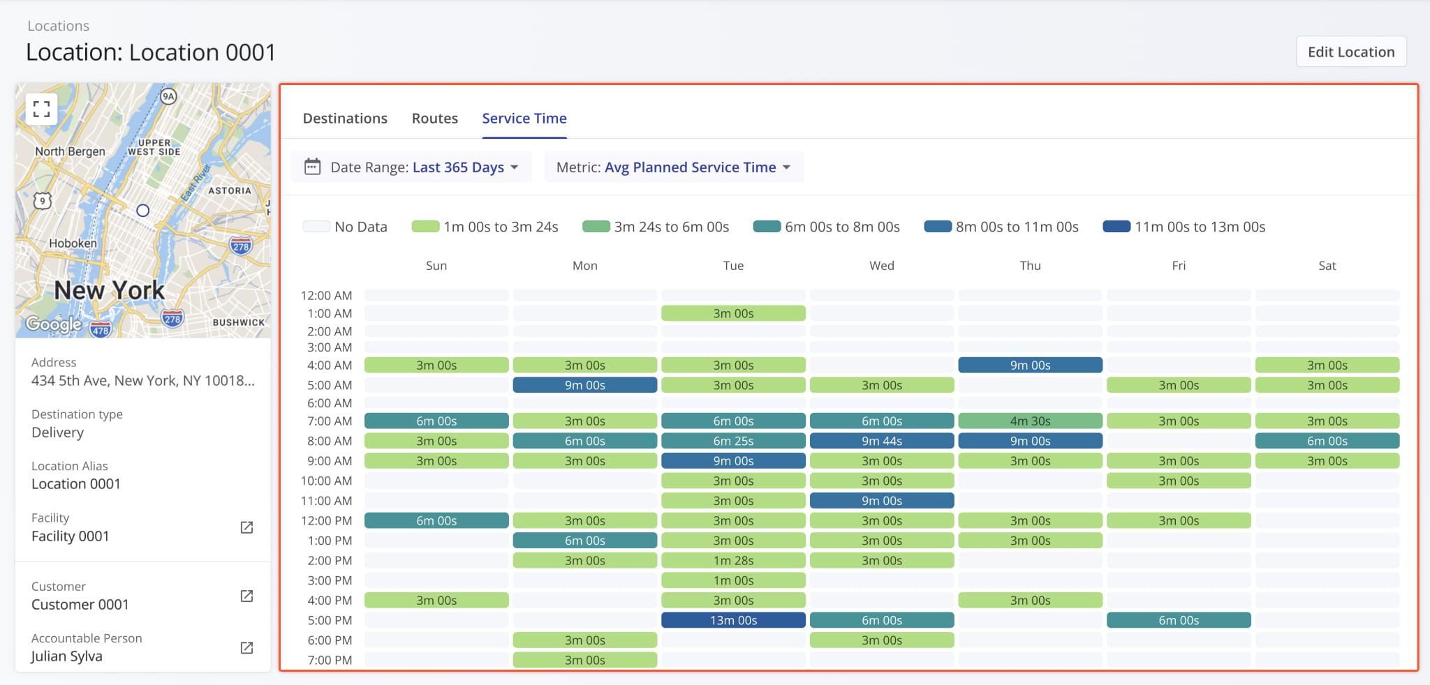 A new “Service Time” category was added to Location Snapshots. It shows the distribution of Destination Service Time at a Location across the days of the week over the specified time period. This update enables you to get a clear overview of how the planned, reported, and detected Service Time at a Location is distributed.