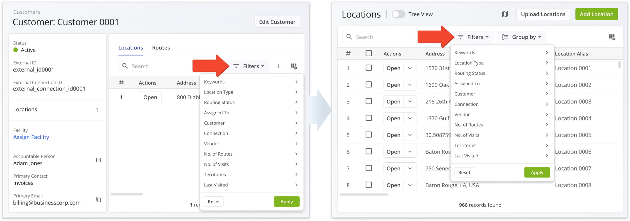 The available filters in the “Locations” section of Customer Snapshots now match the filters available on your Locations Page. Unified filters enable you to easily find Locations no matter which interface you’re using, improving consistency and efficiency.