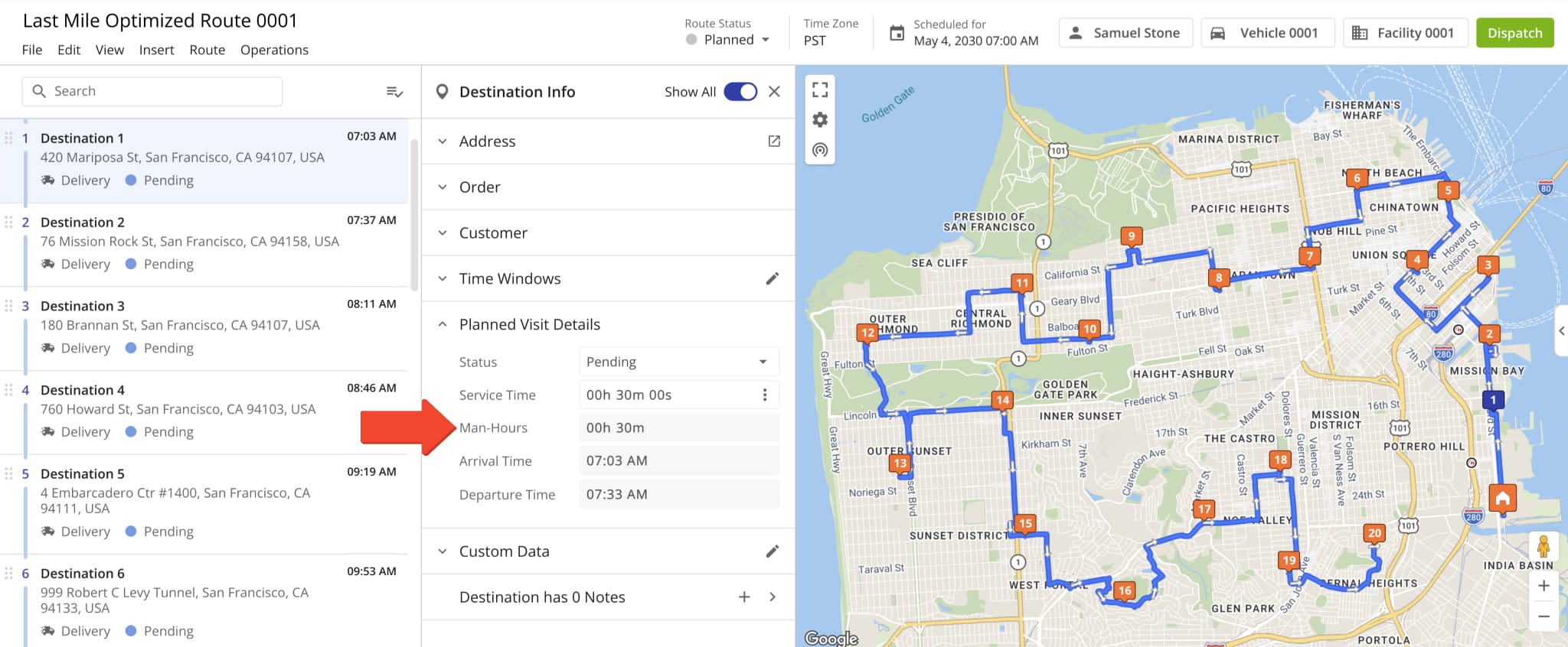 Destination ETAs on the Interactive Routes Map now show “Service Time” and “Man-Hours“. Previously, only four destination schedule fields were available. Now, our dynamic ETAs provide a more comprehensive overview of destination schedules.