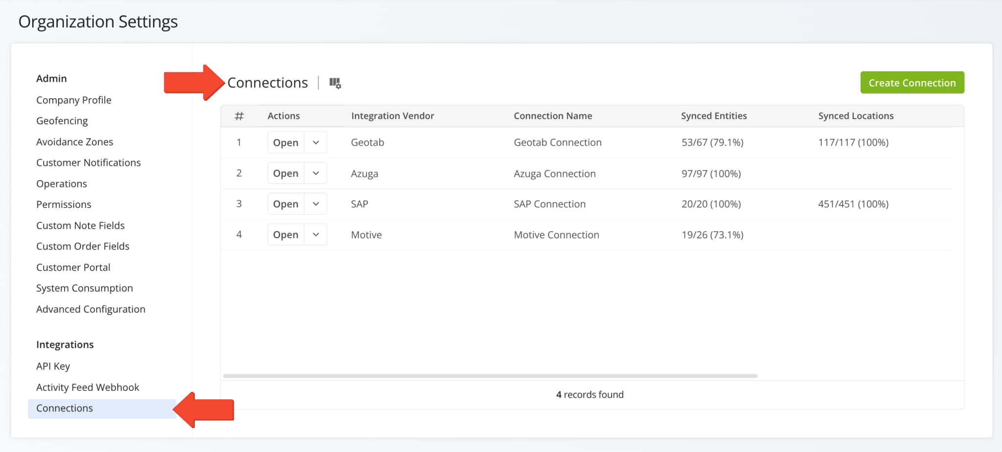 The “Telematics Connections” section of the Organization Settings page has been renamed to “Connections“. Accordingly, “Telematics Vendors” have been renamed to “Vendors“. This update reflects Route4Me’s expanded integration and connection functionality, enabling you to sync not just telematics vehicles to your account but also locations and other entities.
