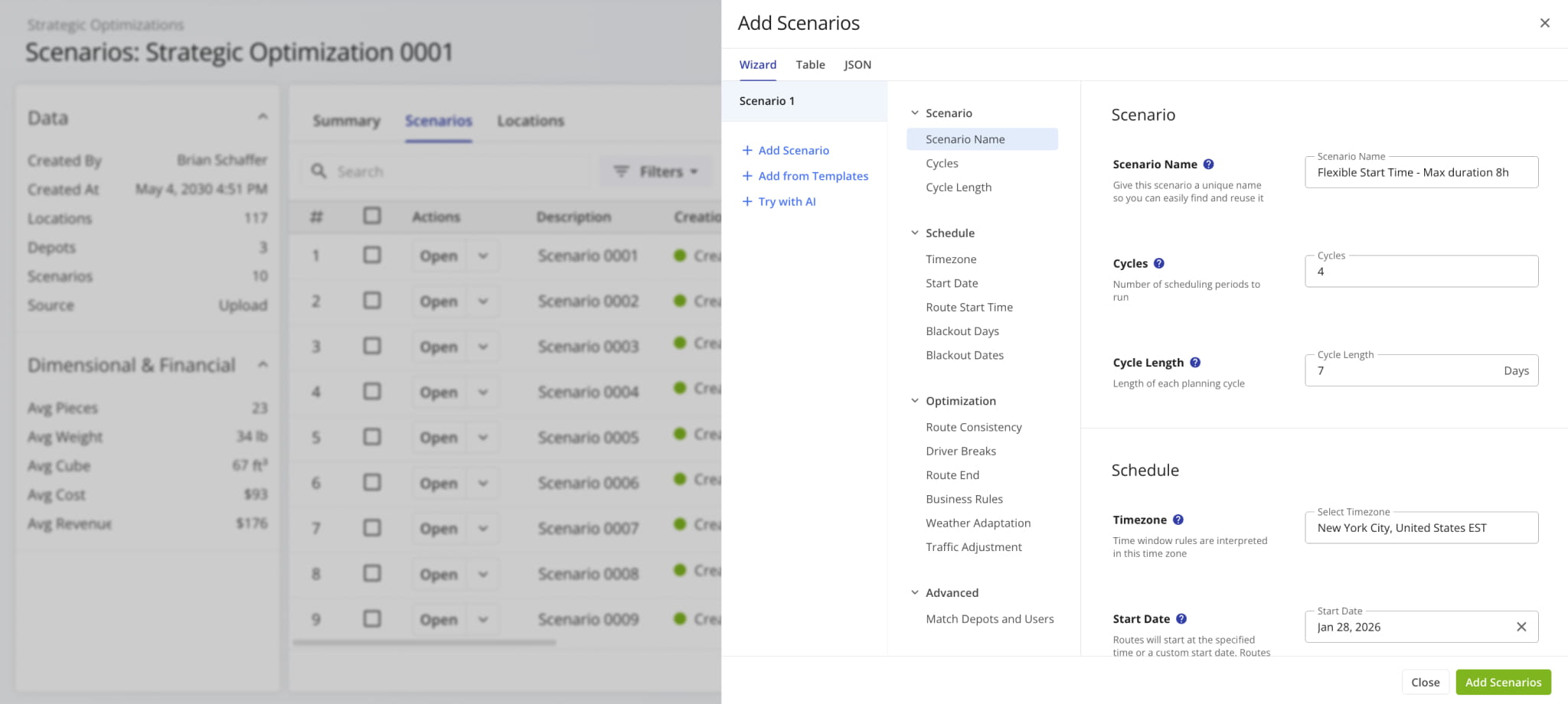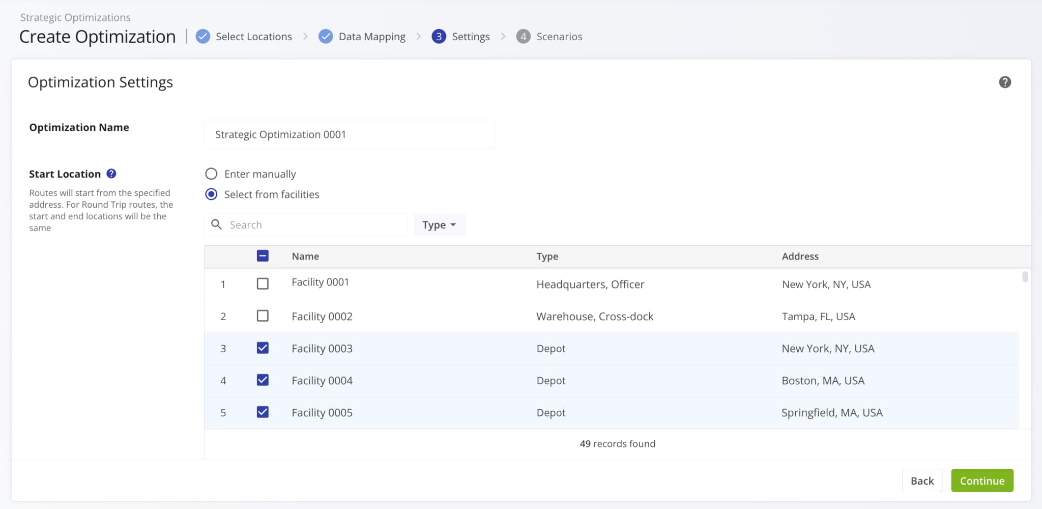 The “Start Location” section of the settings screen when you Create Strategic Optimizations was improved. A new dynamic map provides a visual overview of the start locations you’ve added. Additionally, you can now add start locations from your account Facilities or add addresses on the same screen by clicking the respective buttons.