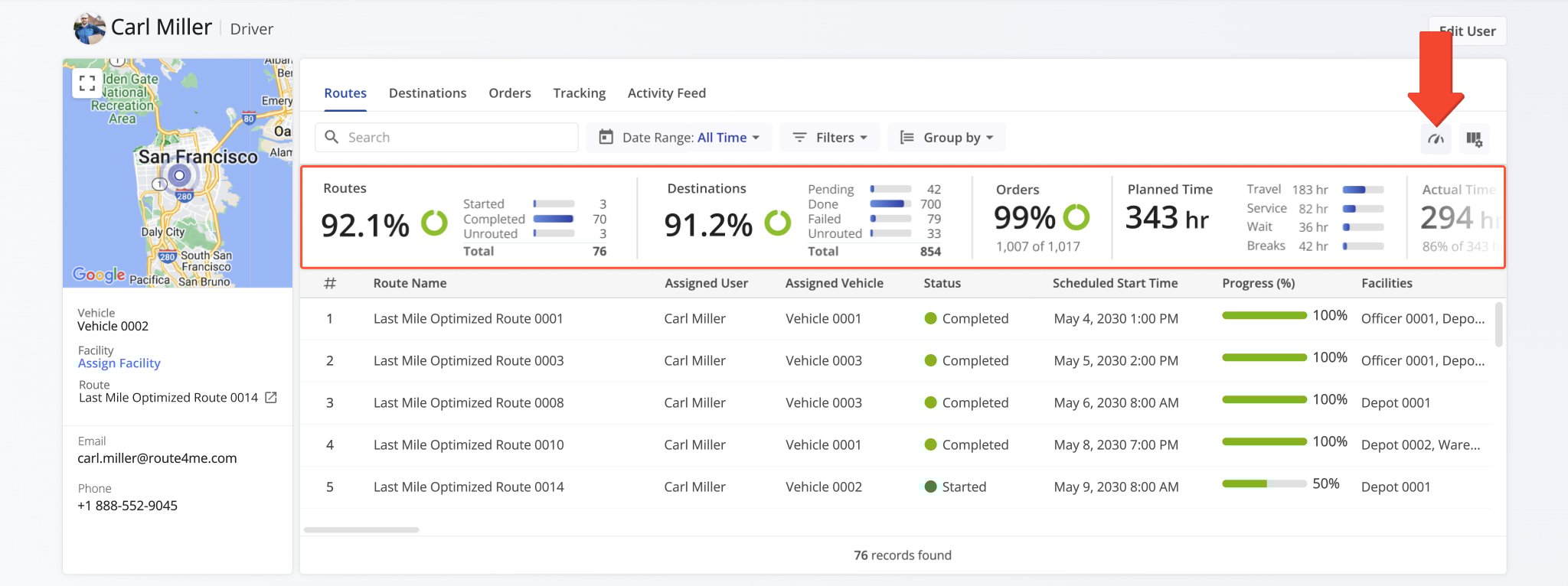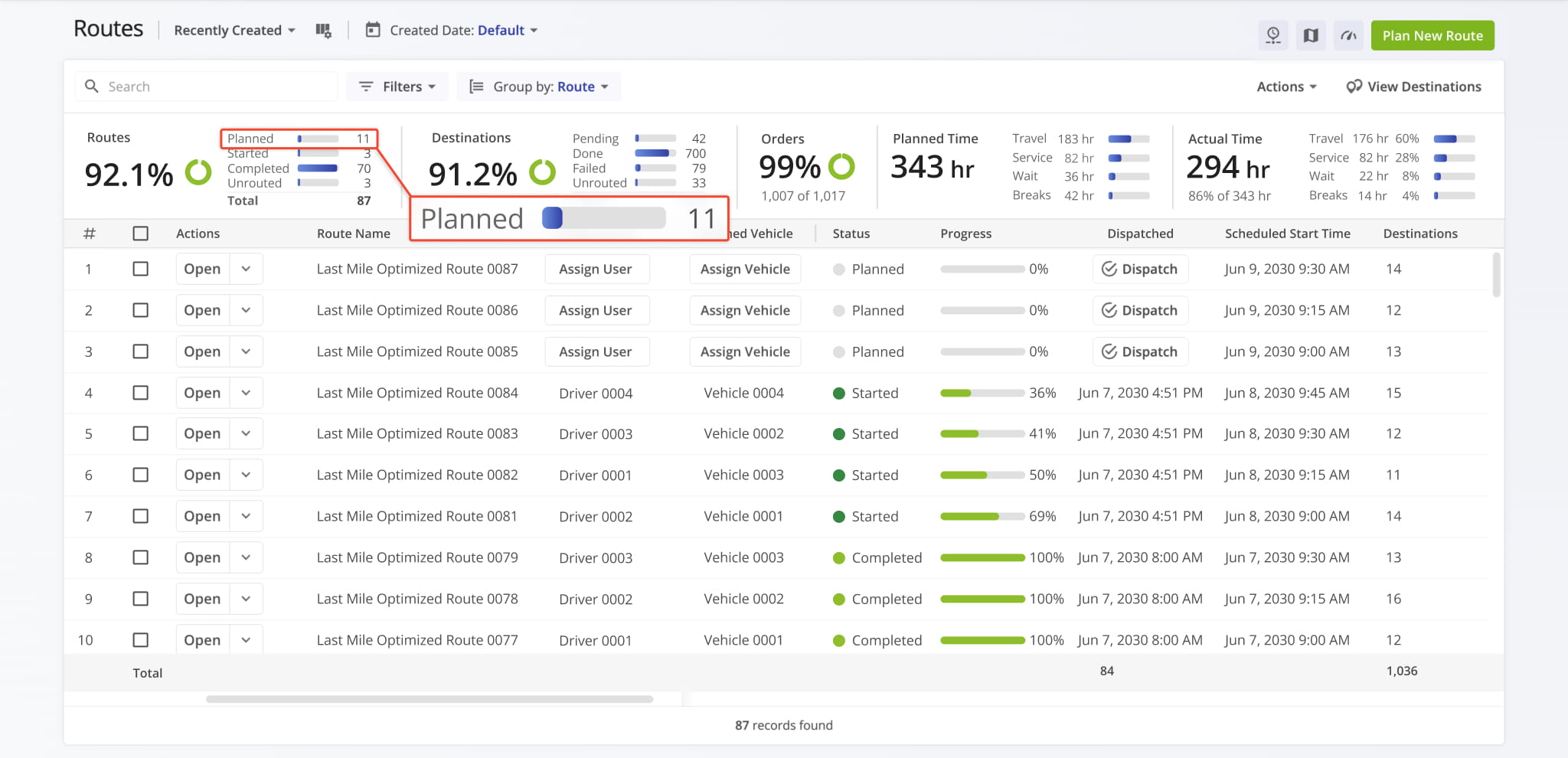 A new “Planned” field was added to the “Routes” section of the Route Performance Metrics dashboard. It shows the total number of filtered routes that have the “Planned” status (optimized and scheduled).
