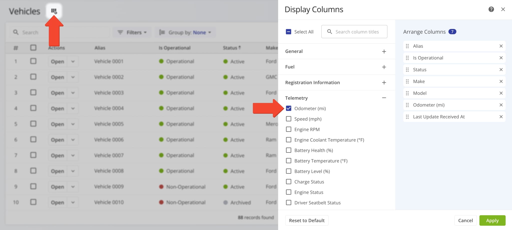 A new vehicle odometer column was added to the Vehicles Page in “Display Columns” > “Telemetry“.