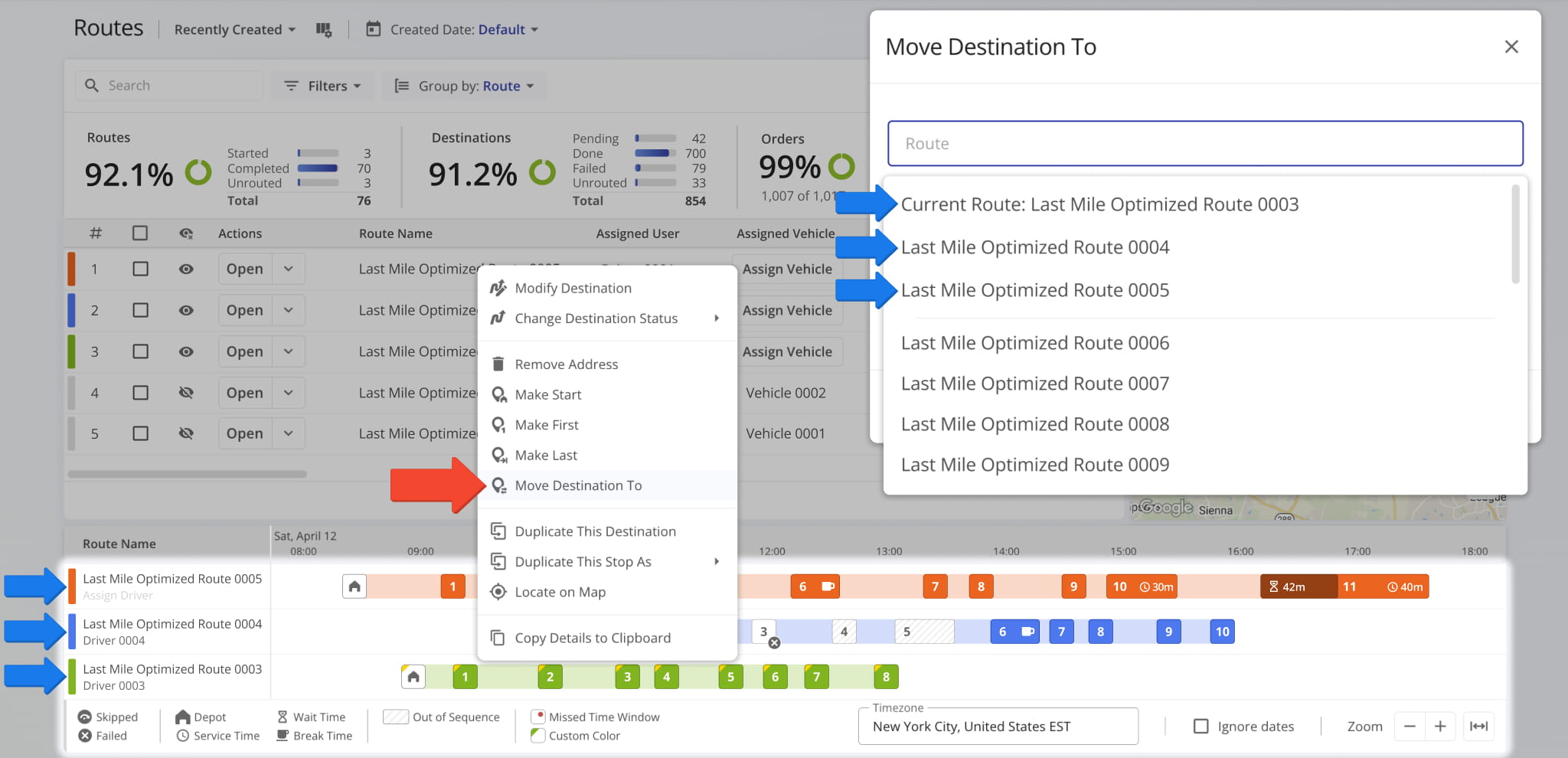 When you right-click a destination in the Routes Timeline, you can select “Move Destination To” to change its position in the sequence. Now, you’re also able to move it into a different route at any sequence position. The routes currently enabled in the timeline will be grouped at the top of the suggested routes list.