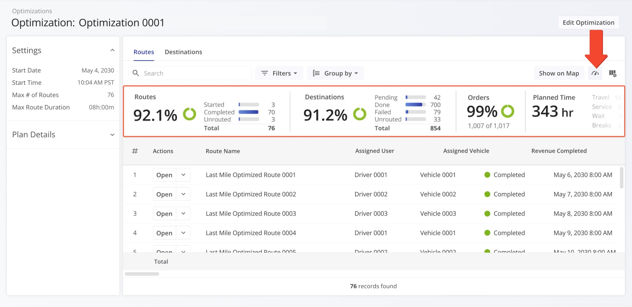 The Route Performance Metrics feature was added to Optimization Snapshots. The Performance Metrics panel provides a summary of an optimization’s associated planned and completed routes, destinations, orders, time distribution, etc. It enables you to monitor progress, track efficiency, and evaluate operational performance with clear data visualization.