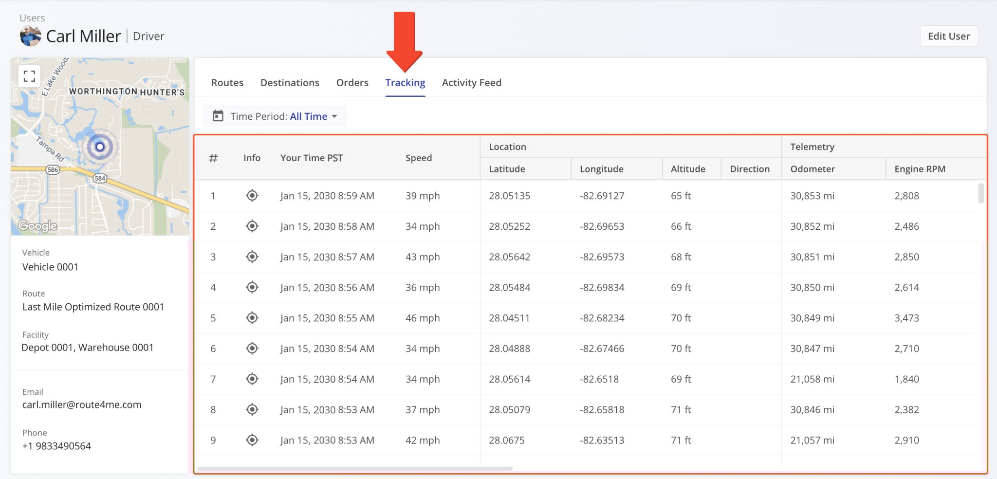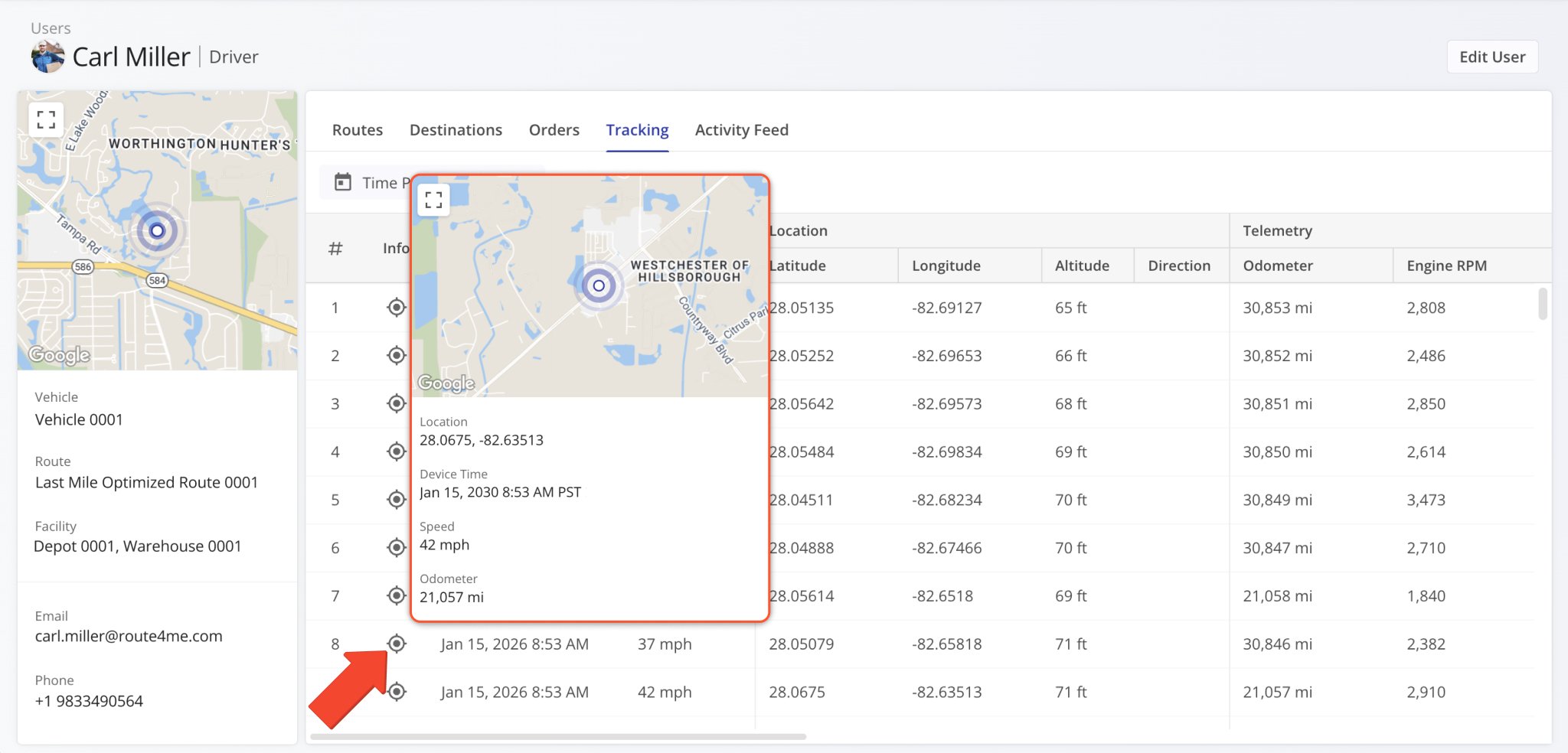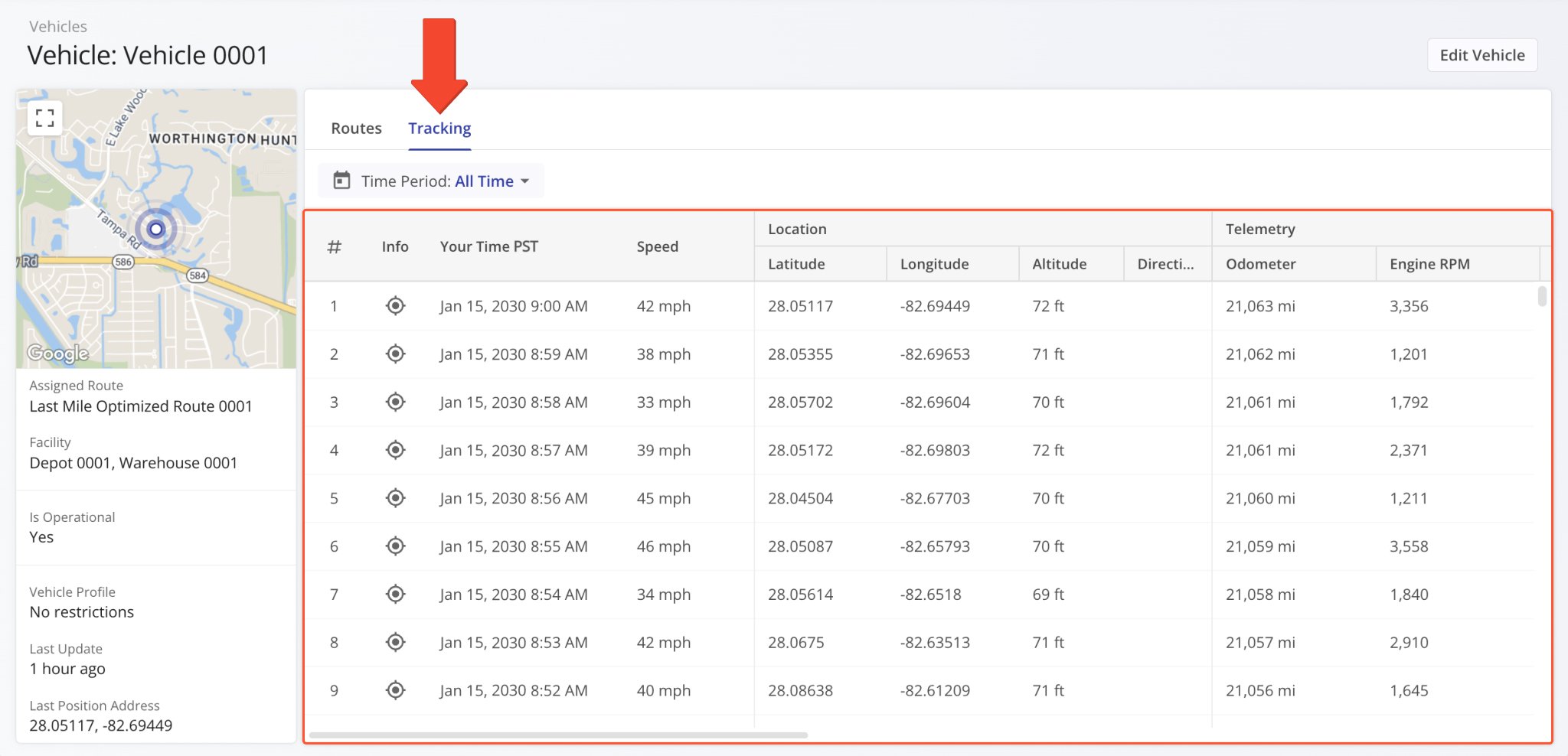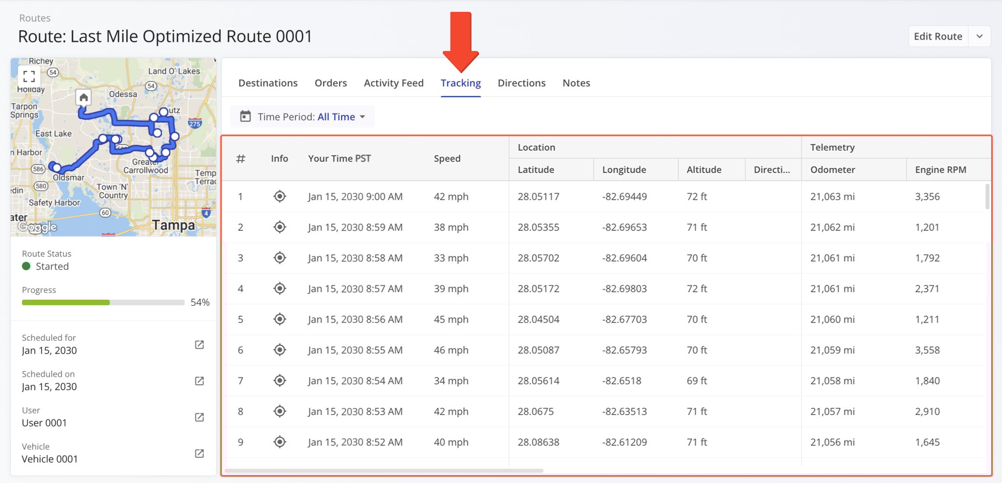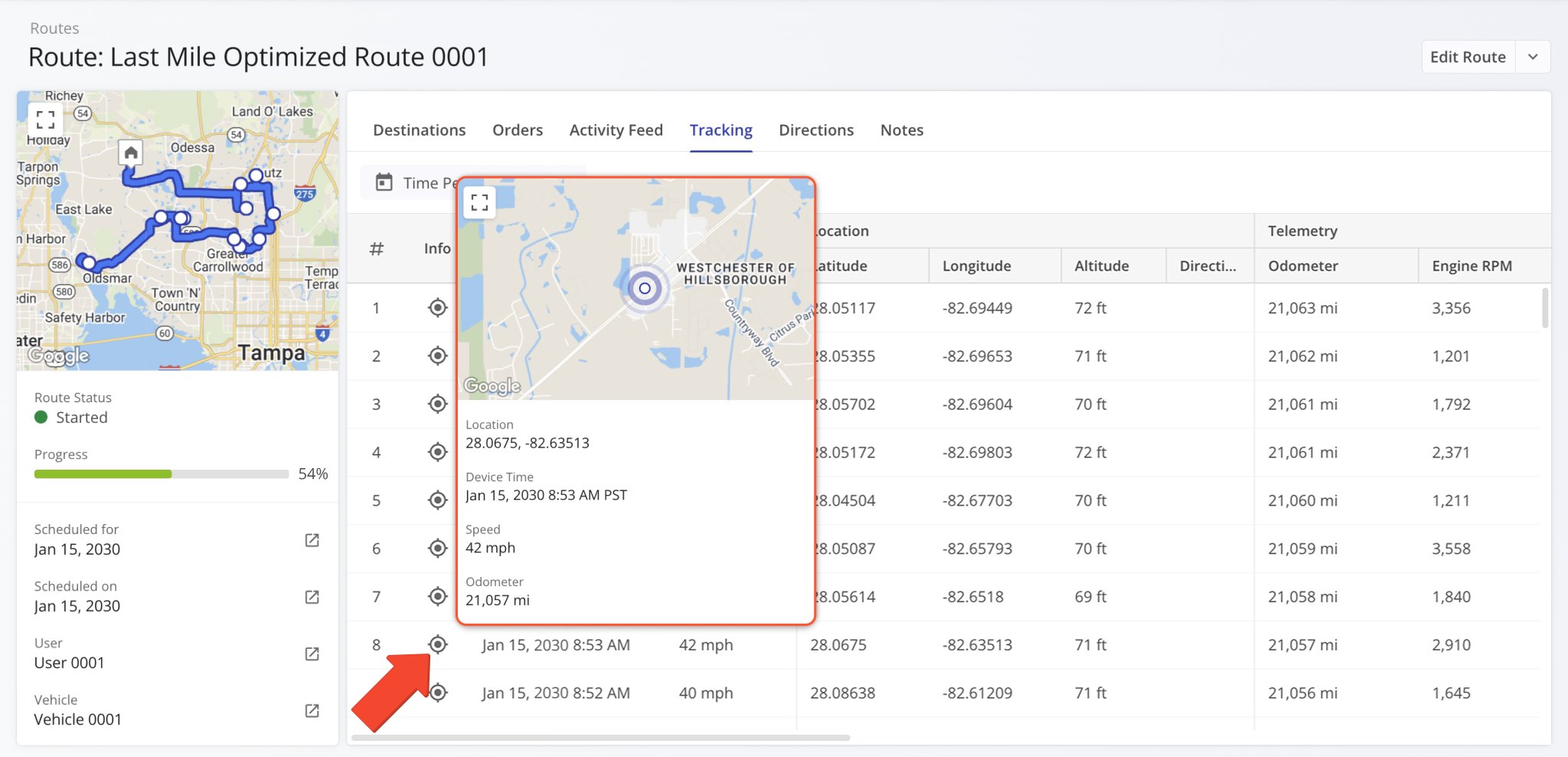 A new “Tracking” section was added to Route Snapshots. In the “Tracking” tab, you can see a list of location updates associated with a route. Each update corresponds to an instance when the assigned user or vehicle’s location was synced. Tracking updates contain timestamps, coordinate and location details, and detailed vehicle information if synced via Telematics Integration.