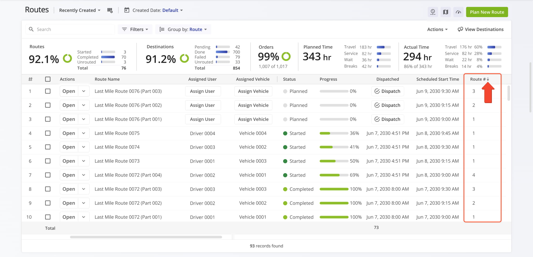 The route sequence display column “Route #” on the Routes Page can now be used to sort routes according to their optimization sequence. When you optimize multiple routes with one optimization, routes optimized earlier have a lower number than routes optimized later. When you optimize a single route, its “Route #” value will always be “1“.