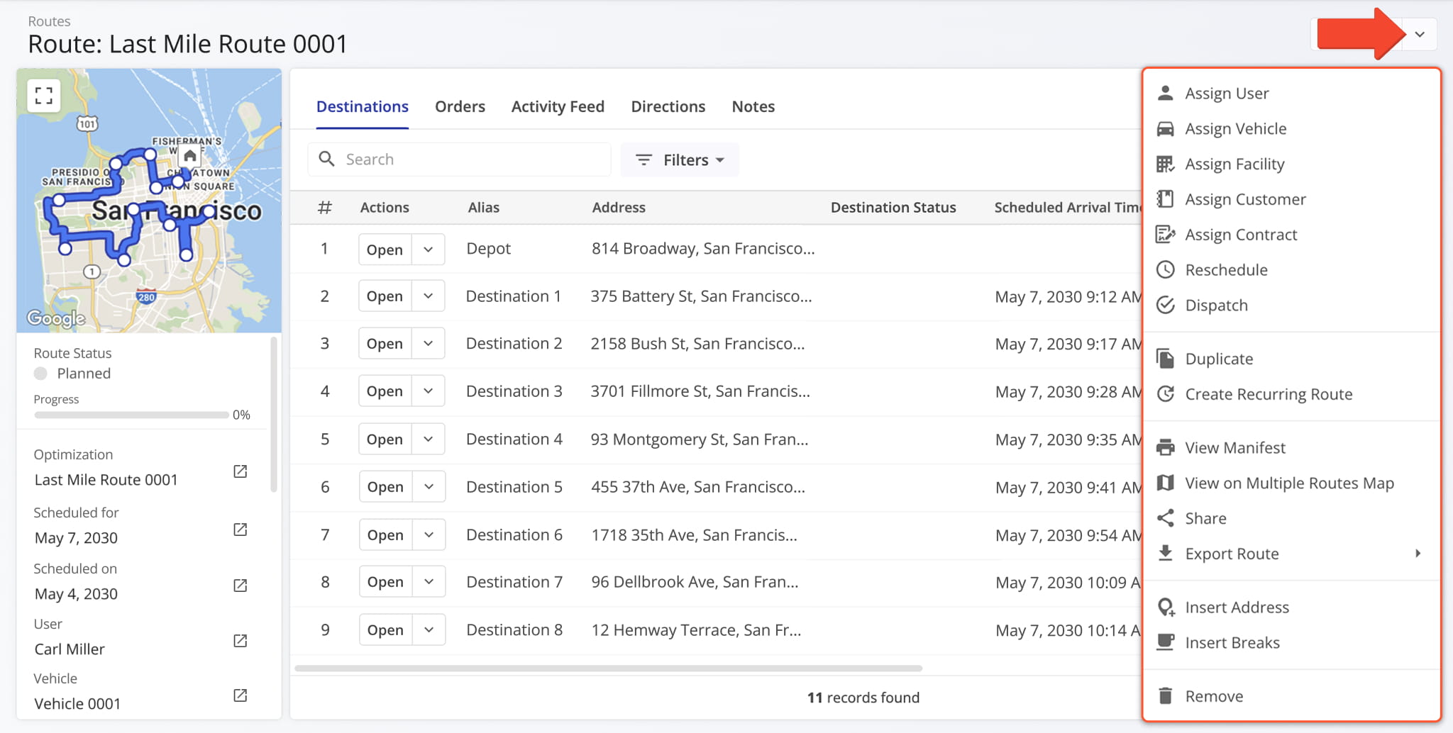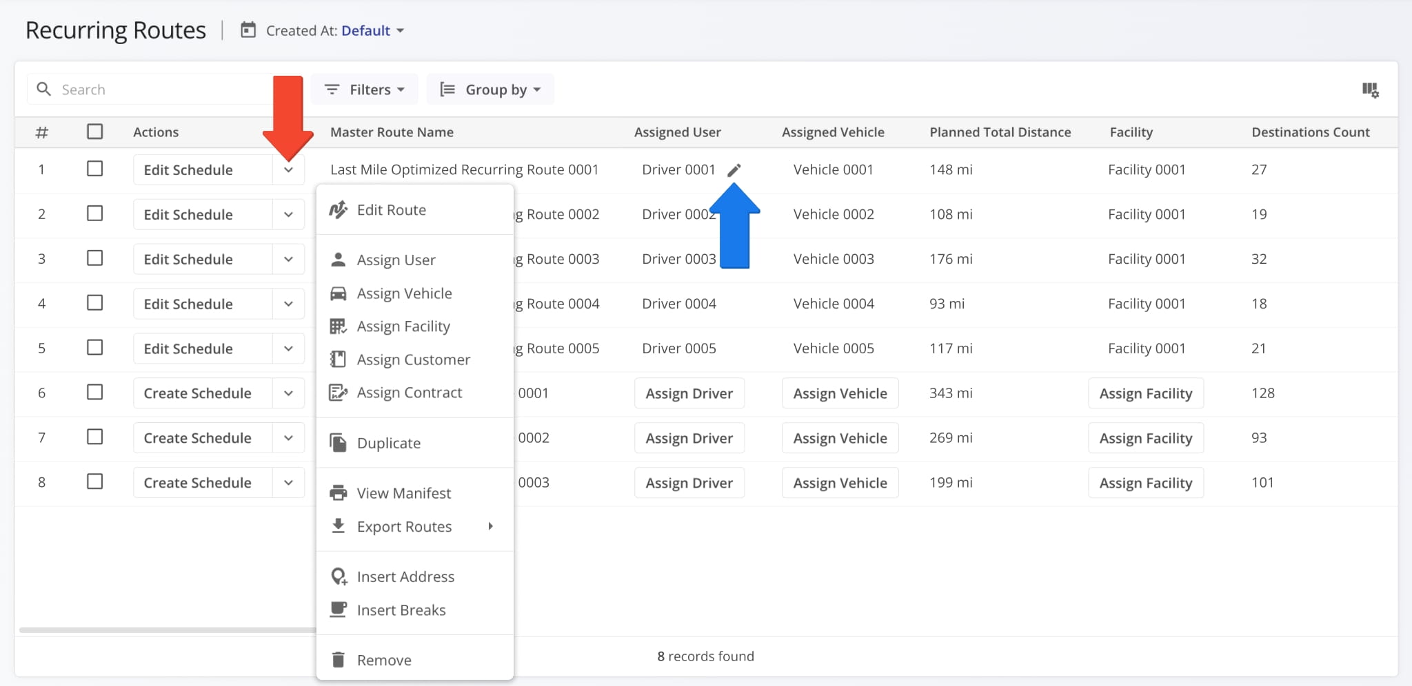 A new management action menu was added to your Recurring Routes, enabling you to make quick edits to Master Routes without opening the Route Editor. You can also directly assign users, vehicles, facilities, customers, and contracts from the data table by clicking the corresponding field. See the list below to learn more about the new quick edit actions.