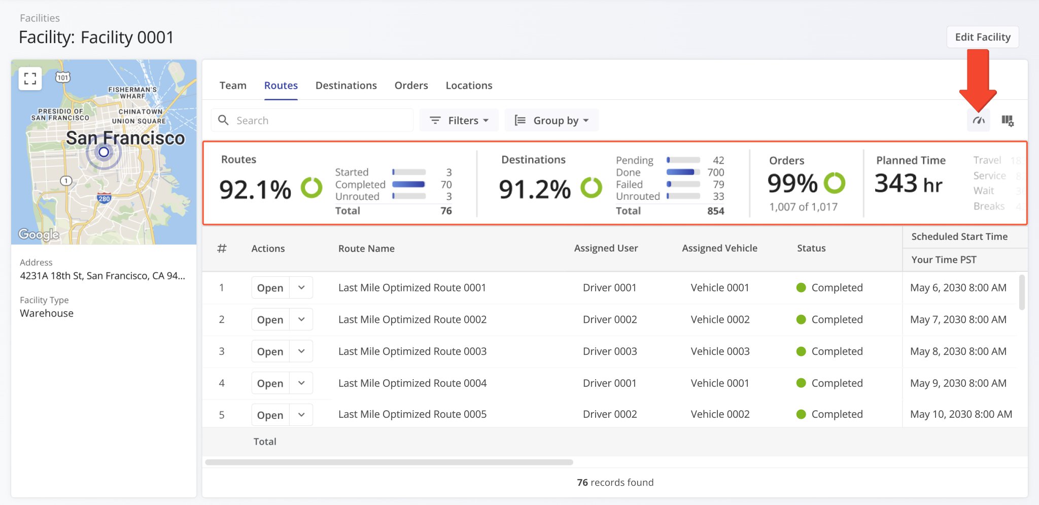 The Route Performance Metrics feature was added to Facility Snapshots. The Performance Metrics panel provides a summary of the facility’s associated planned and completed routes, destinations, orders, time distribution, etc. It enables you to monitor progress, track efficiency, and evaluate operational performance across your organization with clear data visualization.