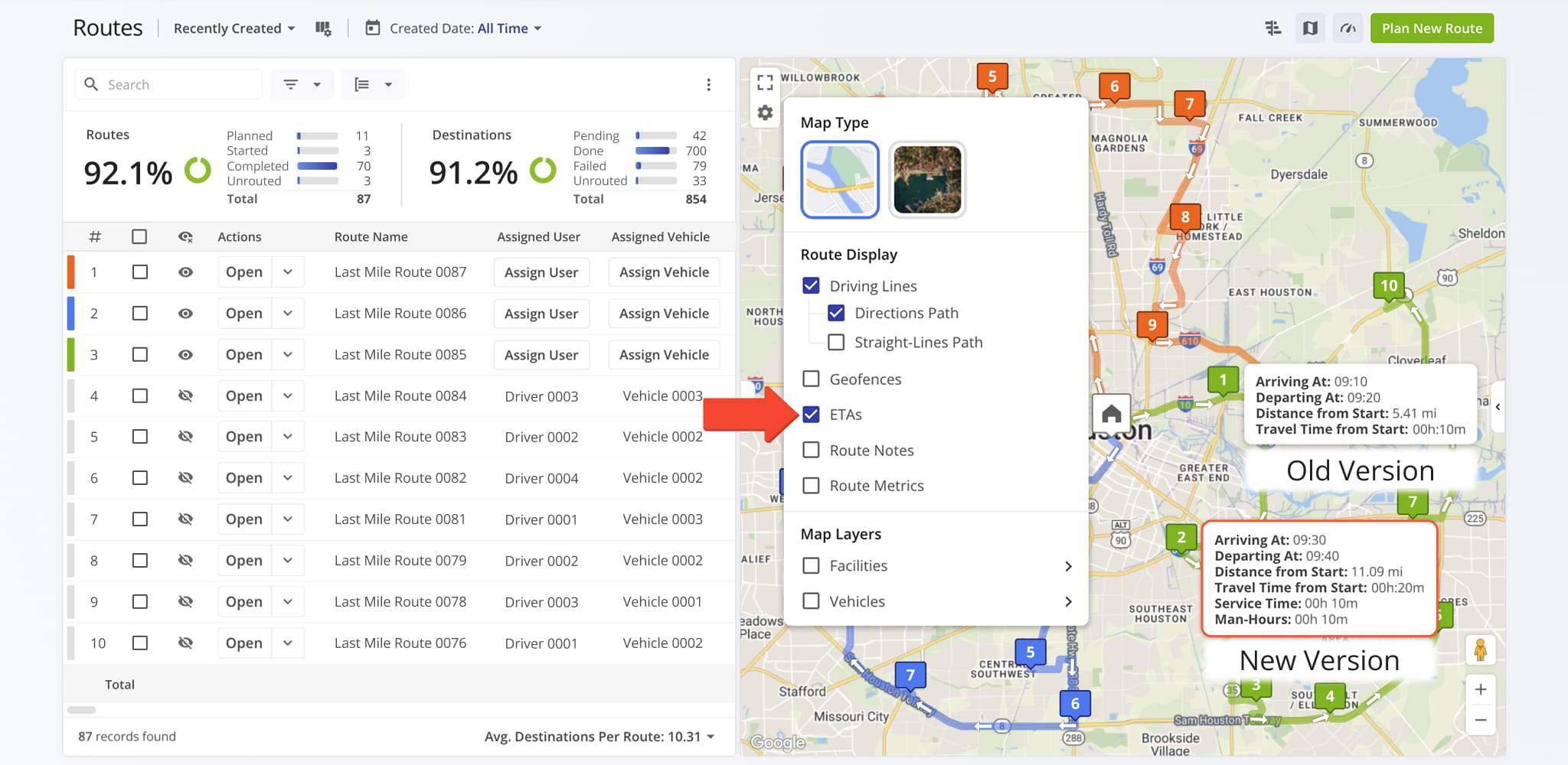 To enable Destination ETAs, click the Gear Icon on the Routes Page Map and check the “ETAs” box.