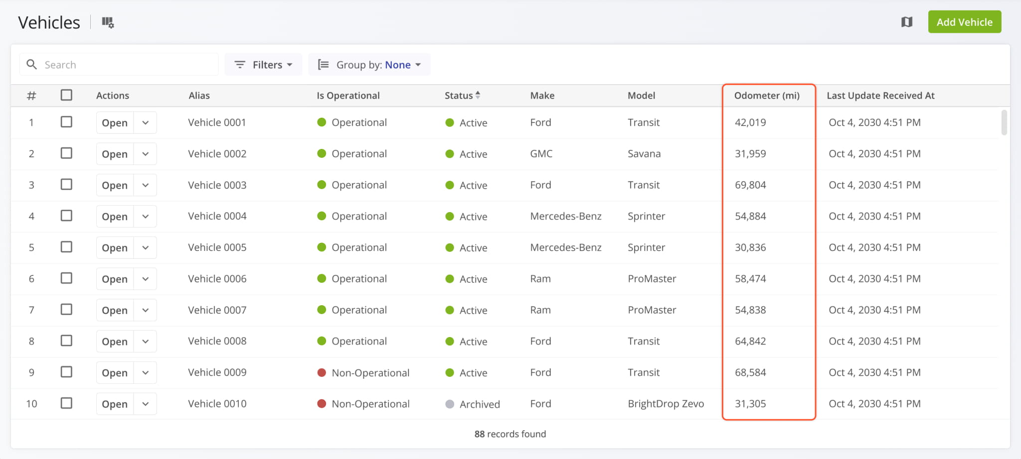 The “Odometer (mi)” column shows the most recent total mileage value of your fleet vehicles.