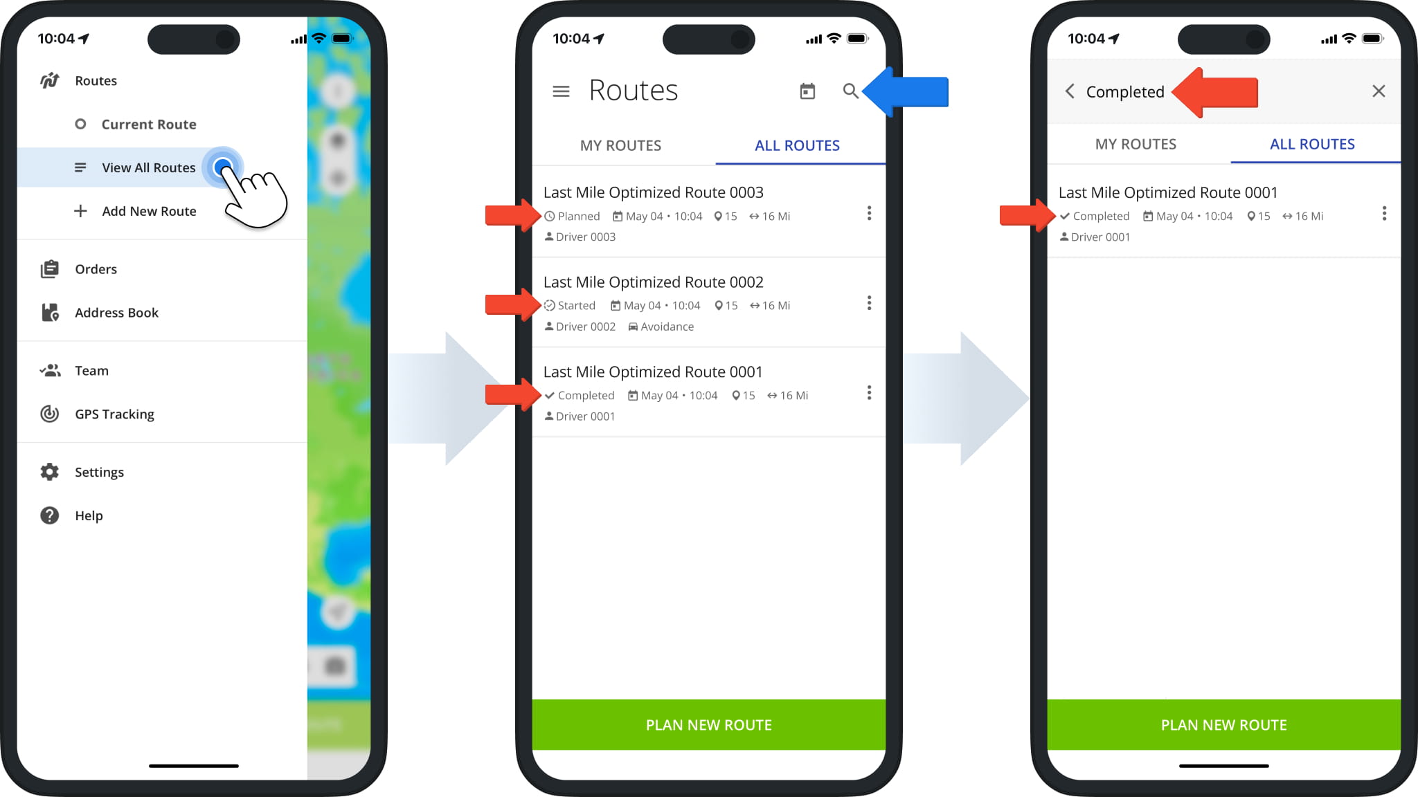 Route Status indicators were added to the Routes List in the Route4Me Mobile App. This enables users to easily see the the current status (“Planned“, “Started“, or “Completed“) of routes. By tapping the Search Icon and inputting a status, users can easily find all routes visible to them with the corresponding route status. Learn more about Mobile Route Management.