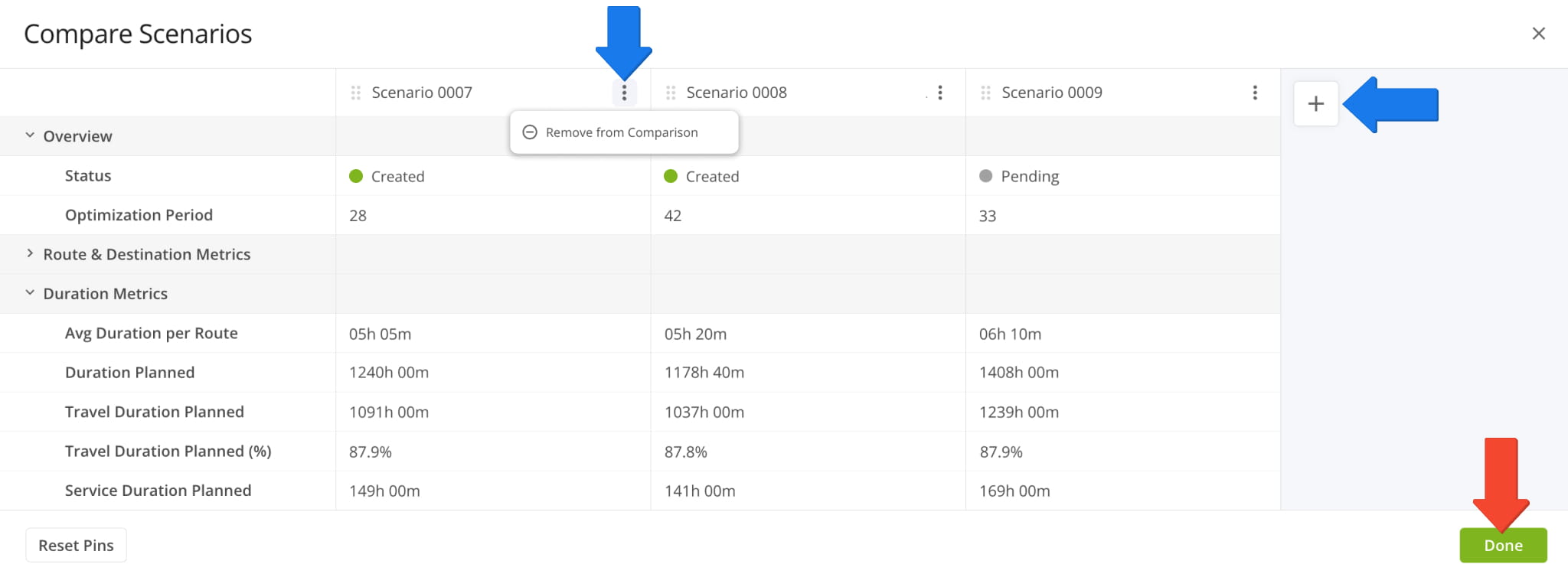 The “Compare Scenarios” interface will arrange your selected scenarios side by side. From there, you can add more scenarios by clicking the Plus Button or remove a scenario by clicking the Three-dot Button and selecting “Remove from Comparison“. When you’re finished comparing Strategic Scenarios, click the “Done” button to go back.