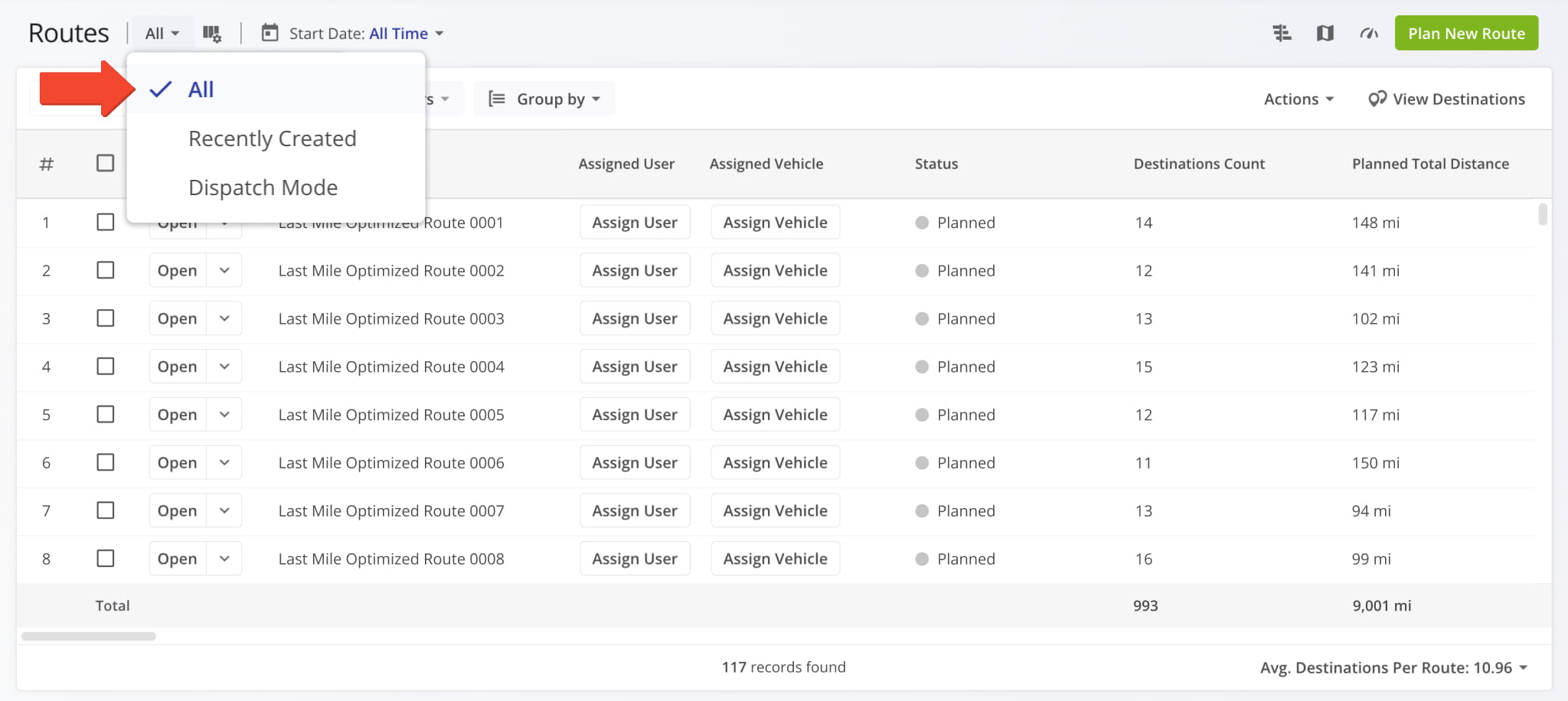 A new “All” View Mode was added to the Routes Page. When selected, it uses the “All Time” setting for the date filter and displays all routes on the account. Previously, only “Recently Created” and “Dispatch Mode” were available.