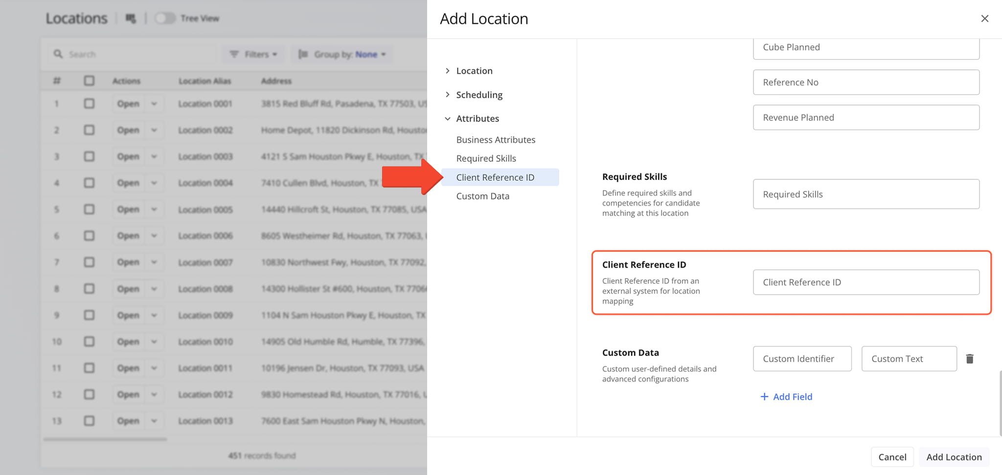 A new “Client Reference ID” field was added to the supported fields with adding and editting Customer Locations. This enables you to add Client Reference IDs from external systems to your locations for better integrated location mapping.