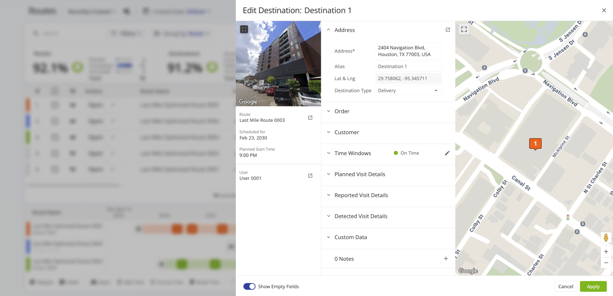 This opens the “Edit Destination” panel where you can see and modify destination details and open associated entities (route, user, etc.). The functionality of the “Edit Destination” interface is similar to the “Destination Info” in of your Route Editor.
