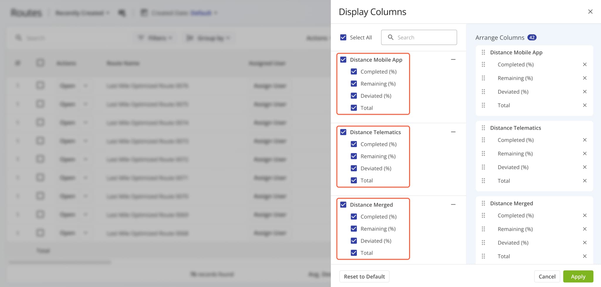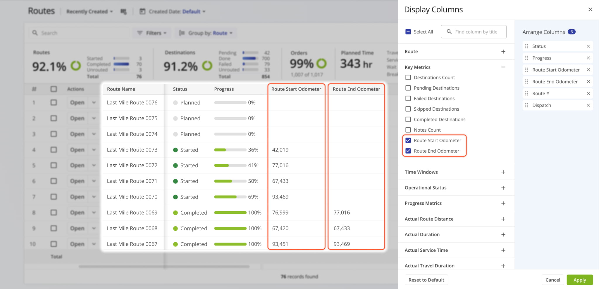 New vehicle odometer columns have been added to the Routes Page in “Display Columns” > “Key Metrics“.