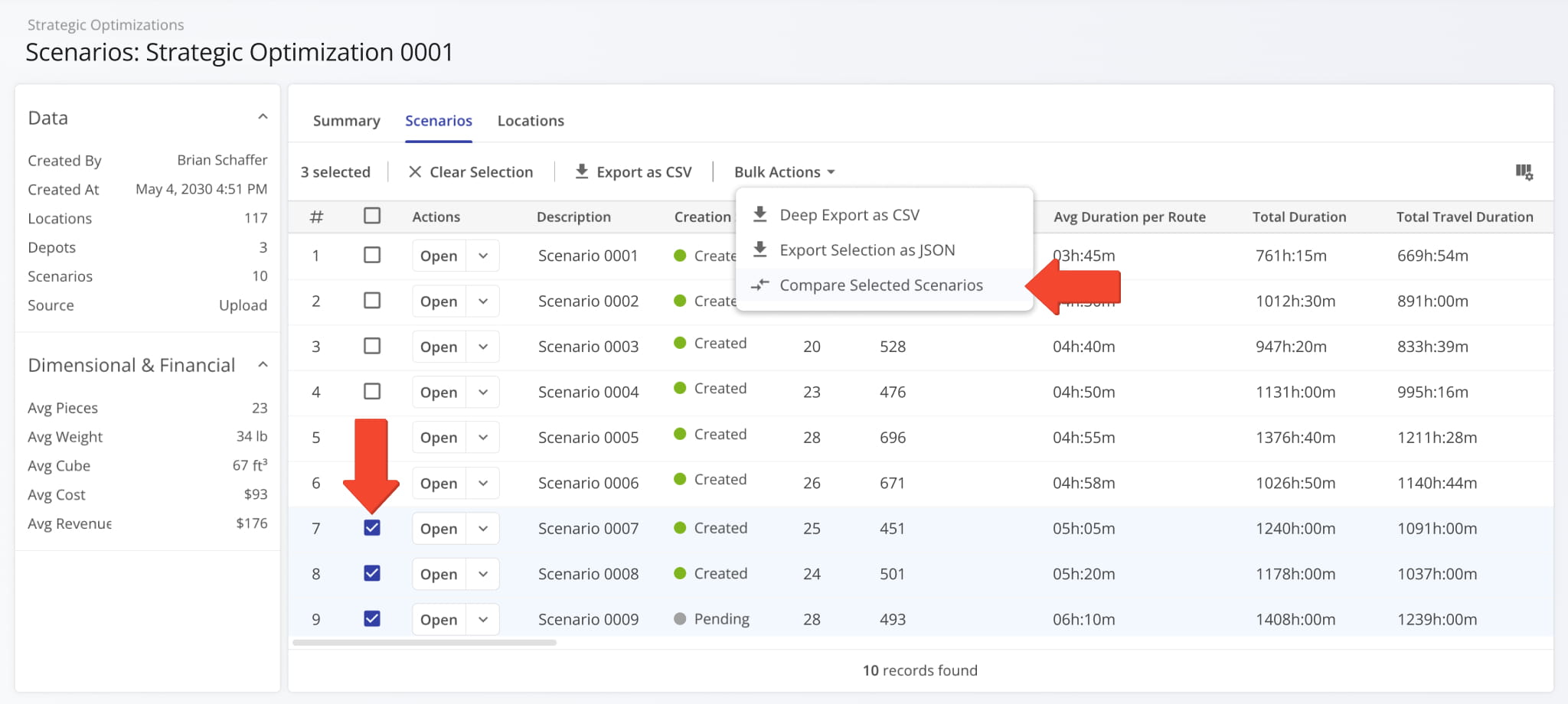 Comparison functionality was also added to Strategic Scenarios in open Strategic Optimizations. Go to the “Scenarios” tab, check the boxes next to the scenarios you want to compare, click “Bulk Actions“, and select “Compare Selected Scenarios“.