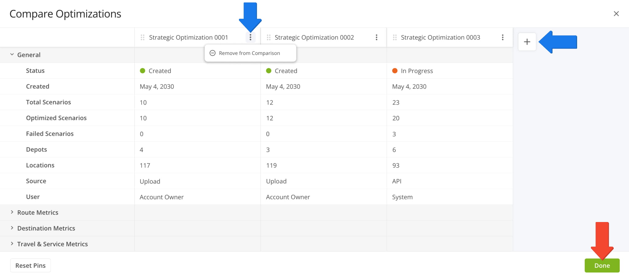 The “Compare Optimizations” interface will arrange your selected optimizations side by side. From there, you can add more optimizations by clicking the Plus Button or remove an optimization by clicking the Three-dot Button and selecting “Remove from Comparison“. When you’re finished comparing Strategic Optimizations, click the “Done” button to go back.